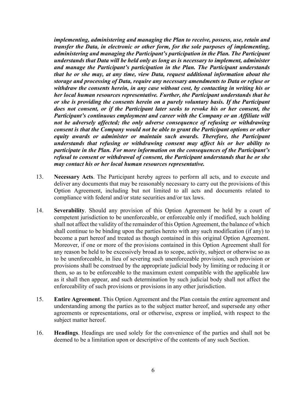6 implementing, administering and managing the Plan to receive, possess, use, retain and transfer the Data, in electronic or other form, for the sole purposes of implementing, administering and managing the Participant’s participation in the Plan. The Participant understands that Data will be held only as long as is necessary to implement, administer and manage the Participant’s participation in the Plan. The Participant understands that he or she may, at any time, view Data, request additional information about the storage and processing of Data, require any necessary amendments to Data or refuse or withdraw the consents herein, in any case without cost, by contacting in writing his or her local human resources representative. Further, the Participant understands that he or she is providing the consents herein on a purely voluntary basis. If the Participant does not consent, or if the Participant later seeks to revoke his or her consent, the Participant’s continuous employment and career with the Company or an Affiliate will not be adversely affected; the only adverse consequence of refusing or withdrawing consent is that the Company would not be able to grant the Participant options or other equity awards or administer or maintain such awards. Therefore, the Participant understands that refusing or withdrawing consent may affect his or her ability to participate in the Plan. For more information on the consequences of the Participant’s refusal to consent or withdrawal of consent, the Participant understands that he or she may contact his or her local human resources representative. 13. Necessary Acts. The Participant hereby agrees to perform all acts, and to execute and deliver any documents that may be reasonably necessary to carry out the provisions of this Option Agreement, including but not limited to all acts and documents related to compliance with federal and/or state securities and/or tax laws. 14. Severability. Should any provision of this Option Agreement be held by a court of competent jurisdiction to be unenforceable, or enforceable only if modified, such holding shall not affect the validity of the remainder of this Option Agreement, the balance of which shall continue to be binding upon the parties hereto with any such modification (if any) to become a part hereof and treated as though contained in this original Option Agreement. Moreover, if one or more of the provisions contained in this Option Agreement shall for any reason be held to be excessively broad as to scope, activity, subject or otherwise so as to be unenforceable, in lieu of severing such unenforceable provision, such provision or provisions shall be construed by the appropriate judicial body by limiting or reducing it or them, so as to be enforceable to the maximum extent compatible with the applicable law as it shall then appear, and such determination by such judicial body shall not affect the enforceability of such provisions or provisions in any other jurisdiction. 15. Entire Agreement. This Option Agreement and the Plan contain the entire agreement and understanding among the parties as to the subject matter hereof, and supersede any other agreements or representations, oral or otherwise, express or implied, with respect to the subject matter hereof. 16. Headings. Headings are used solely for the convenience of the parties and shall not be deemed to be a limitation upon or descriptive of the contents of any such Section.