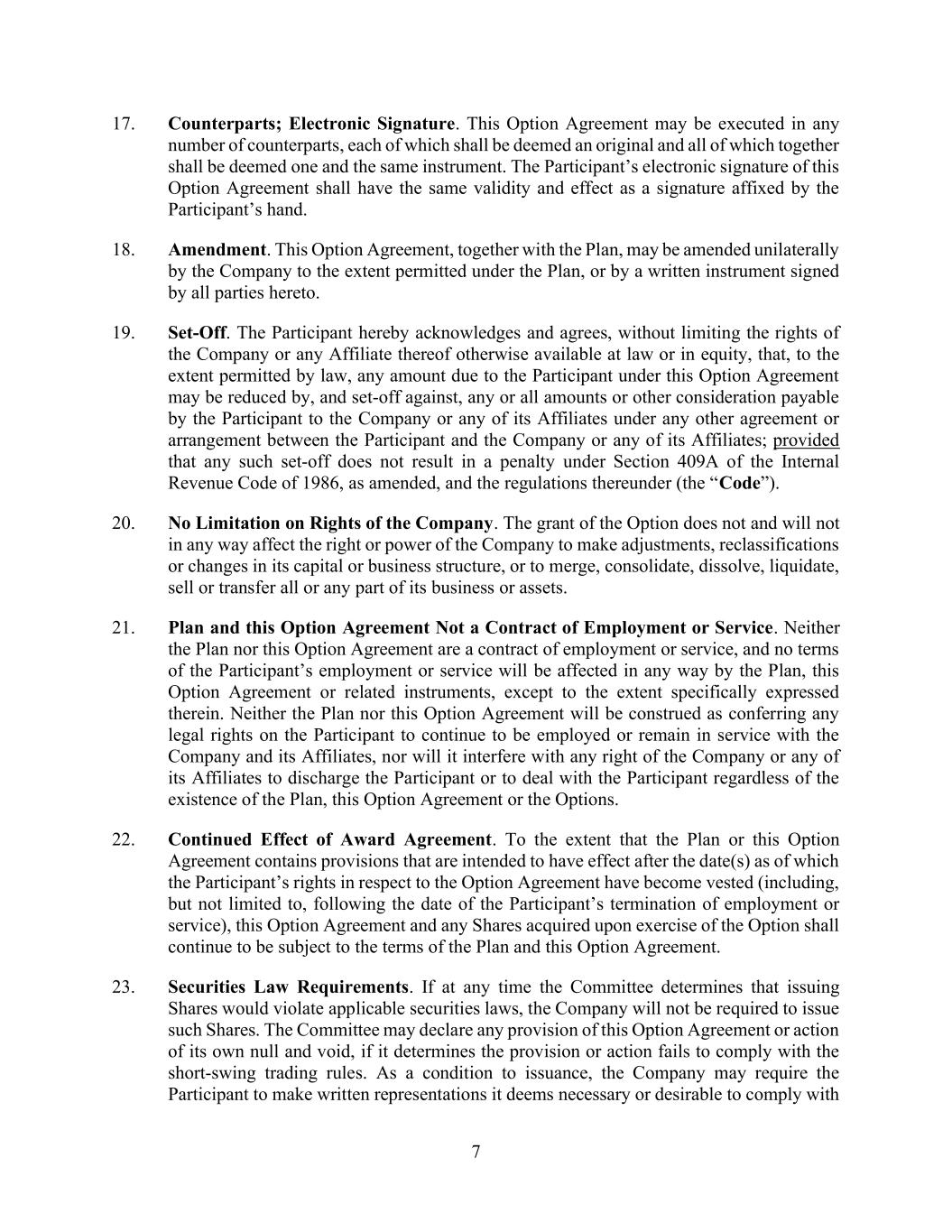 7 17. Counterparts; Electronic Signature. This Option Agreement may be executed in any number of counterparts, each of which shall be deemed an original and all of which together shall be deemed one and the same instrument. The Participant’s electronic signature of this Option Agreement shall have the same validity and effect as a signature affixed by the Participant’s hand. 18. Amendment. This Option Agreement, together with the Plan, may be amended unilaterally by the Company to the extent permitted under the Plan, or by a written instrument signed by all parties hereto. 19. Set-Off. The Participant hereby acknowledges and agrees, without limiting the rights of the Company or any Affiliate thereof otherwise available at law or in equity, that, to the extent permitted by law, any amount due to the Participant under this Option Agreement may be reduced by, and set-off against, any or all amounts or other consideration payable by the Participant to the Company or any of its Affiliates under any other agreement or arrangement between the Participant and the Company or any of its Affiliates; provided that any such set-off does not result in a penalty under Section 409A of the Internal Revenue Code of 1986, as amended, and the regulations thereunder (the “Code”). 20. No Limitation on Rights of the Company. The grant of the Option does not and will not in any way affect the right or power of the Company to make adjustments, reclassifications or changes in its capital or business structure, or to merge, consolidate, dissolve, liquidate, sell or transfer all or any part of its business or assets. 21. Plan and this Option Agreement Not a Contract of Employment or Service. Neither the Plan nor this Option Agreement are a contract of employment or service, and no terms of the Participant’s employment or service will be affected in any way by the Plan, this Option Agreement or related instruments, except to the extent specifically expressed therein. Neither the Plan nor this Option Agreement will be construed as conferring any legal rights on the Participant to continue to be employed or remain in service with the Company and its Affiliates, nor will it interfere with any right of the Company or any of its Affiliates to discharge the Participant or to deal with the Participant regardless of the existence of the Plan, this Option Agreement or the Options. 22. Continued Effect of Award Agreement. To the extent that the Plan or this Option Agreement contains provisions that are intended to have effect after the date(s) as of which the Participant’s rights in respect to the Option Agreement have become vested (including, but not limited to, following the date of the Participant’s termination of employment or service), this Option Agreement and any Shares acquired upon exercise of the Option shall continue to be subject to the terms of the Plan and this Option Agreement. 23. Securities Law Requirements. If at any time the Committee determines that issuing Shares would violate applicable securities laws, the Company will not be required to issue such Shares. The Committee may declare any provision of this Option Agreement or action of its own null and void, if it determines the provision or action fails to comply with the short-swing trading rules. As a condition to issuance, the Company may require the Participant to make written representations it deems necessary or desirable to comply with