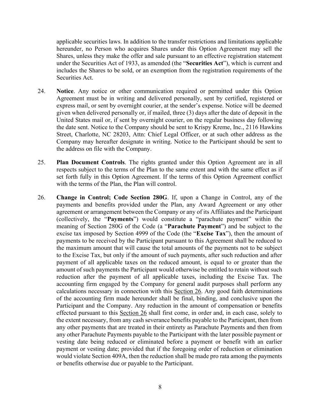 8 applicable securities laws. In addition to the transfer restrictions and limitations applicable hereunder, no Person who acquires Shares under this Option Agreement may sell the Shares, unless they make the offer and sale pursuant to an effective registration statement under the Securities Act of 1933, as amended (the “Securities Act”), which is current and includes the Shares to be sold, or an exemption from the registration requirements of the Securities Act. 24. Notice. Any notice or other communication required or permitted under this Option Agreement must be in writing and delivered personally, sent by certified, registered or express mail, or sent by overnight courier, at the sender’s expense. Notice will be deemed given when delivered personally or, if mailed, three (3) days after the date of deposit in the United States mail or, if sent by overnight courier, on the regular business day following the date sent. Notice to the Company should be sent to Krispy Kreme, Inc., 2116 Hawkins Street, Charlotte, NC 28203, Attn: Chief Legal Officer, or at such other address as the Company may hereafter designate in writing. Notice to the Participant should be sent to the address on file with the Company. 25. Plan Document Controls. The rights granted under this Option Agreement are in all respects subject to the terms of the Plan to the same extent and with the same effect as if set forth fully in this Option Agreement. If the terms of this Option Agreement conflict with the terms of the Plan, the Plan will control. 26. Change in Control; Code Section 280G. If, upon a Change in Control, any of the payments and benefits provided under the Plan, any Award Agreement or any other agreement or arrangement between the Company or any of its Affiliates and the Participant (collectively, the “Payments”) would constitute a “parachute payment” within the meaning of Section 280G of the Code (a “Parachute Payment”) and be subject to the excise tax imposed by Section 4999 of the Code (the “Excise Tax”), then the amount of payments to be received by the Participant pursuant to this Agreement shall be reduced to the maximum amount that will cause the total amounts of the payments not to be subject to the Excise Tax, but only if the amount of such payments, after such reduction and after payment of all applicable taxes on the reduced amount, is equal to or greater than the amount of such payments the Participant would otherwise be entitled to retain without such reduction after the payment of all applicable taxes, including the Excise Tax. The accounting firm engaged by the Company for general audit purposes shall perform any calculations necessary in connection with this Section 26. Any good faith determinations of the accounting firm made hereunder shall be final, binding, and conclusive upon the Participant and the Company. Any reduction in the amount of compensation or benefits effected pursuant to this Section 26 shall first come, in order and, in each case, solely to the extent necessary, from any cash severance benefits payable to the Participant, then from any other payments that are treated in their entirety as Parachute Payments and then from any other Parachute Payments payable to the Participant with the later possible payment or vesting date being reduced or eliminated before a payment or benefit with an earlier payment or vesting date; provided that if the foregoing order of reduction or elimination would violate Section 409A, then the reduction shall be made pro rata among the payments or benefits otherwise due or payable to the Participant.