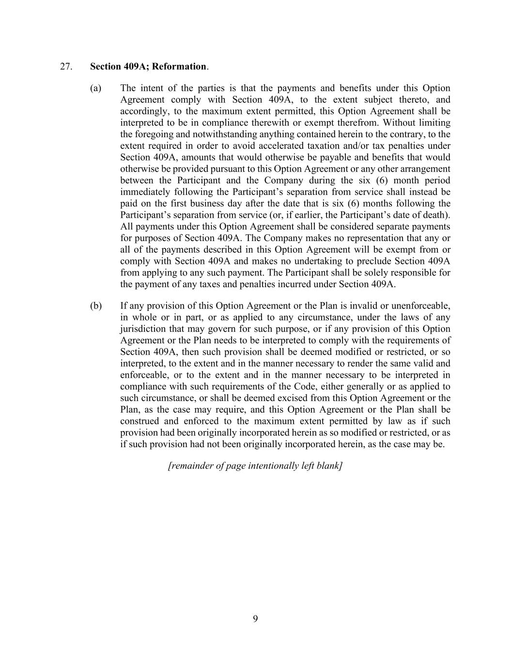 9 27. Section 409A; Reformation. (a) The intent of the parties is that the payments and benefits under this Option Agreement comply with Section 409A, to the extent subject thereto, and accordingly, to the maximum extent permitted, this Option Agreement shall be interpreted to be in compliance therewith or exempt therefrom. Without limiting the foregoing and notwithstanding anything contained herein to the contrary, to the extent required in order to avoid accelerated taxation and/or tax penalties under Section 409A, amounts that would otherwise be payable and benefits that would otherwise be provided pursuant to this Option Agreement or any other arrangement between the Participant and the Company during the six (6) month period immediately following the Participant’s separation from service shall instead be paid on the first business day after the date that is six (6) months following the Participant’s separation from service (or, if earlier, the Participant’s date of death). All payments under this Option Agreement shall be considered separate payments for purposes of Section 409A. The Company makes no representation that any or all of the payments described in this Option Agreement will be exempt from or comply with Section 409A and makes no undertaking to preclude Section 409A from applying to any such payment. The Participant shall be solely responsible for the payment of any taxes and penalties incurred under Section 409A. (b) If any provision of this Option Agreement or the Plan is invalid or unenforceable, in whole or in part, or as applied to any circumstance, under the laws of any jurisdiction that may govern for such purpose, or if any provision of this Option Agreement or the Plan needs to be interpreted to comply with the requirements of Section 409A, then such provision shall be deemed modified or restricted, or so interpreted, to the extent and in the manner necessary to render the same valid and enforceable, or to the extent and in the manner necessary to be interpreted in compliance with such requirements of the Code, either generally or as applied to such circumstance, or shall be deemed excised from this Option Agreement or the Plan, as the case may require, and this Option Agreement or the Plan shall be construed and enforced to the maximum extent permitted by law as if such provision had been originally incorporated herein as so modified or restricted, or as if such provision had not been originally incorporated herein, as the case may be. [remainder of page intentionally left blank]