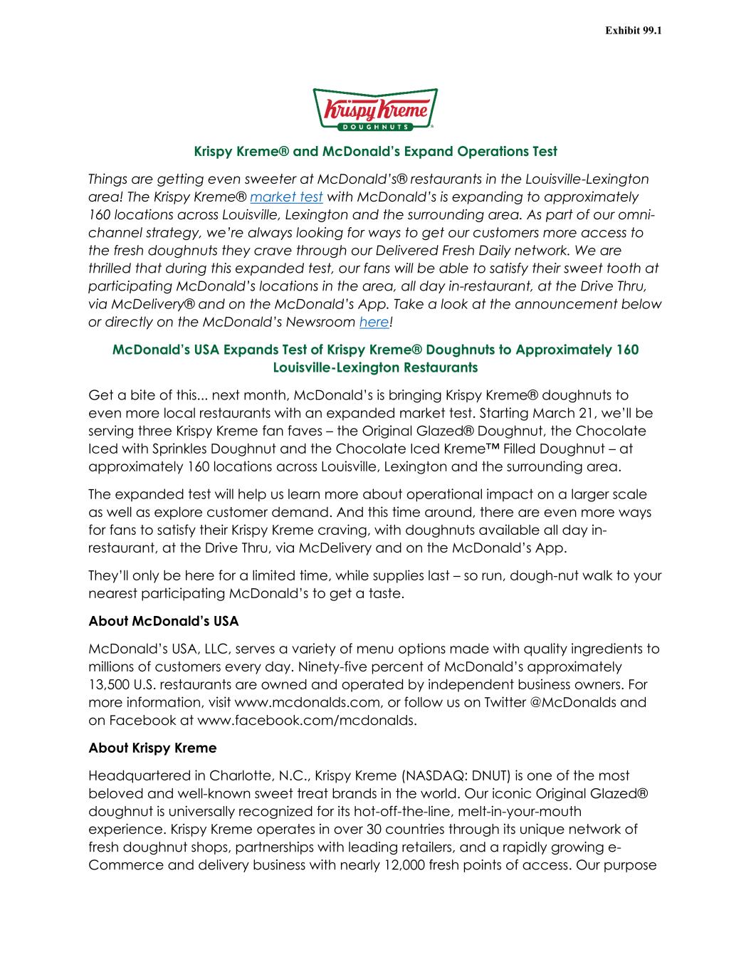 Krispy Kreme® and McDonald’s Expand Operations Test Things are getting even sweeter at McDonald’s® restaurants in the Louisville-Lexington area! The Krispy Kreme® market test with McDonald’s is expanding to approximately 160 locations across Louisville, Lexington and the surrounding area. As part of our omni- channel strategy, we’re always looking for ways to get our customers more access to the fresh doughnuts they crave through our Delivered Fresh Daily network. We are thrilled that during this expanded test, our fans will be able to satisfy their sweet tooth at participating McDonald’s locations in the area, all day in-restaurant, at the Drive Thru, via McDelivery® and on the McDonald’s App. Take a look at the announcement below or directly on the McDonald’s Newsroom here! McDonald’s USA Expands Test of Krispy Kreme® Doughnuts to Approximately 160 Louisville-Lexington Restaurants Get a bite of this... next month, McDonald’s is bringing Krispy Kreme® doughnuts to even more local restaurants with an expanded market test. Starting March 21, we’ll be serving three Krispy Kreme fan faves – the Original Glazed® Doughnut, the Chocolate Iced with Sprinkles Doughnut and the Chocolate Iced Kreme™ Filled Doughnut – at approximately 160 locations across Louisville, Lexington and the surrounding area. The expanded test will help us learn more about operational impact on a larger scale as well as explore customer demand. And this time around, there are even more ways for fans to satisfy their Krispy Kreme craving, with doughnuts available all day in- restaurant, at the Drive Thru, via McDelivery and on the McDonald’s App. They’ll only be here for a limited time, while supplies last – so run, dough-nut walk to your nearest participating McDonald’s to get a taste. About McDonald’s USA McDonald’s USA, LLC, serves a variety of menu options made with quality ingredients to millions of customers every day. Ninety-five percent of McDonald’s approximately 13,500 U.S. restaurants are owned and operated by independent business owners. For more information, visit www.mcdonalds.com, or follow us on Twitter @McDonalds and on Facebook at www.facebook.com/mcdonalds. About Krispy Kreme Headquartered in Charlotte, N.C., Krispy Kreme (NASDAQ: DNUT) is one of the most beloved and well-known sweet treat brands in the world. Our iconic Original Glazed® doughnut is universally recognized for its hot-off-the-line, melt-in-your-mouth experience. Krispy Kreme operates in over 30 countries through its unique network of fresh doughnut shops, partnerships with leading retailers, and a rapidly growing e- Commerce and delivery business with nearly 12,000 fresh points of access. Our purpose