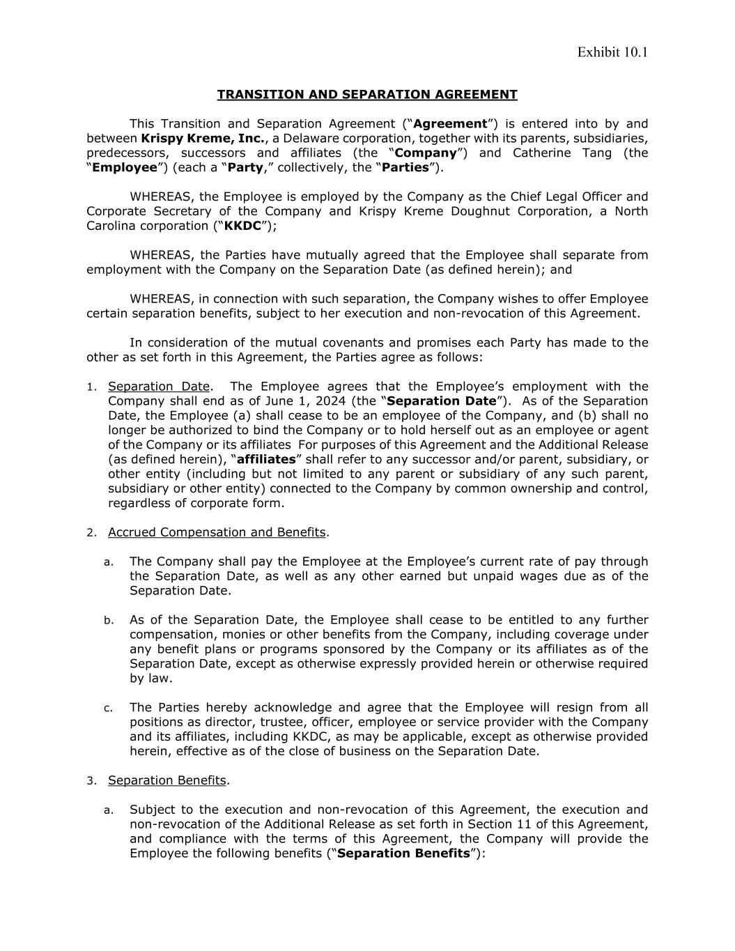 Exhibit 10.1 TRANSITION AND SEPARATION AGREEMENT This Transition and Separation Agreement (“Agreement”) is entered into by and between Krispy Kreme, Inc., a Delaware corporation, together with its parents, subsidiaries, predecessors, successors and affiliates (the “Company”) and Catherine Tang (the “Employee”) (each a “Party,” collectively, the “Parties”). WHEREAS, the Employee is employed by the Company as the Chief Legal Officer and Corporate Secretary of the Company and Krispy Kreme Doughnut Corporation, a North Carolina corporation (“KKDC”); WHEREAS, the Parties have mutually agreed that the Employee shall separate from employment with the Company on the Separation Date (as defined herein); and WHEREAS, in connection with such separation, the Company wishes to offer Employee certain separation benefits, subject to her execution and non-revocation of this Agreement. In consideration of the mutual covenants and promises each Party has made to the other as set forth in this Agreement, the Parties agree as follows: 1. Separation Date. The Employee agrees that the Employee’s employment with the Company shall end as of June 1, 2024 (the “Separation Date”). As of the Separation Date, the Employee (a) shall cease to be an employee of the Company, and (b) shall no longer be authorized to bind the Company or to hold herself out as an employee or agent of the Company or its affiliates For purposes of this Agreement and the Additional Release (as defined herein), “affiliates” shall refer to any successor and/or parent, subsidiary, or other entity (including but not limited to any parent or subsidiary of any such parent, subsidiary or other entity) connected to the Company by common ownership and control, regardless of corporate form. 2. Accrued Compensation and Benefits. a. The Company shall pay the Employee at the Employee’s current rate of pay through the Separation Date, as well as any other earned but unpaid wages due as of the Separation Date. b. As of the Separation Date, the Employee shall cease to be entitled to any further compensation, monies or other benefits from the Company, including coverage under any benefit plans or programs sponsored by the Company or its affiliates as of the Separation Date, except as otherwise expressly provided herein or otherwise required by law. c. The Parties hereby acknowledge and agree that the Employee will resign from all positions as director, trustee, officer, employee or service provider with the Company and its affiliates, including KKDC, as may be applicable, except as otherwise provided herein, effective as of the close of business on the Separation Date. 3. Separation Benefits. a. Subject to the execution and non-revocation of this Agreement, the execution and non-revocation of the Additional Release as set forth in Section 11 of this Agreement, and compliance with the terms of this Agreement, the Company will provide the Employee the following benefits (“Separation Benefits”):