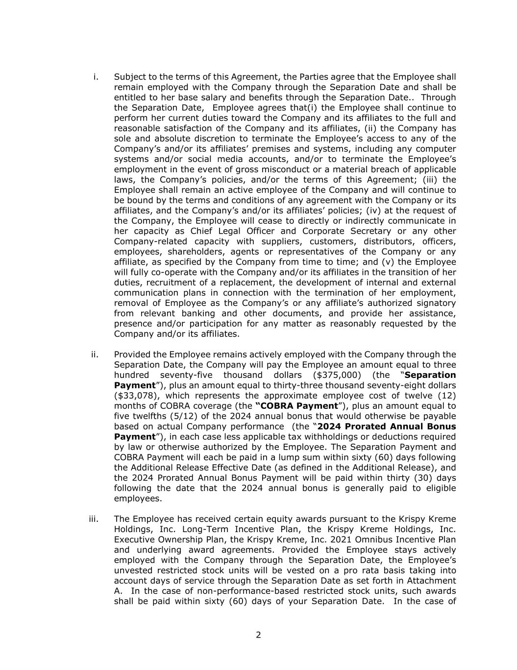 2 i. Subject to the terms of this Agreement, the Parties agree that the Employee shall remain employed with the Company through the Separation Date and shall be entitled to her base salary and benefits through the Separation Date.. Through the Separation Date, Employee agrees that(i) the Employee shall continue to perform her current duties toward the Company and its affiliates to the full and reasonable satisfaction of the Company and its affiliates, (ii) the Company has sole and absolute discretion to terminate the Employee’s access to any of the Company’s and/or its affiliates’ premises and systems, including any computer systems and/or social media accounts, and/or to terminate the Employee’s employment in the event of gross misconduct or a material breach of applicable laws, the Company’s policies, and/or the terms of this Agreement; (iii) the Employee shall remain an active employee of the Company and will continue to be bound by the terms and conditions of any agreement with the Company or its affiliates, and the Company’s and/or its affiliates’ policies; (iv) at the request of the Company, the Employee will cease to directly or indirectly communicate in her capacity as Chief Legal Officer and Corporate Secretary or any other Company-related capacity with suppliers, customers, distributors, officers, employees, shareholders, agents or representatives of the Company or any affiliate, as specified by the Company from time to time; and (v) the Employee will fully co-operate with the Company and/or its affiliates in the transition of her duties, recruitment of a replacement, the development of internal and external communication plans in connection with the termination of her employment, removal of Employee as the Company’s or any affiliate’s authorized signatory from relevant banking and other documents, and provide her assistance, presence and/or participation for any matter as reasonably requested by the Company and/or its affiliates. ii. Provided the Employee remains actively employed with the Company through the Separation Date, the Company will pay the Employee an amount equal to three hundred seventy-five thousand dollars ($375,000) (the “Separation Payment”), plus an amount equal to thirty-three thousand seventy-eight dollars ($33,078), which represents the approximate employee cost of twelve (12) months of COBRA coverage (the “COBRA Payment”), plus an amount equal to five twelfths (5/12) of the 2024 annual bonus that would otherwise be payable based on actual Company performance (the “2024 Prorated Annual Bonus Payment”), in each case less applicable tax withholdings or deductions required by law or otherwise authorized by the Employee. The Separation Payment and COBRA Payment will each be paid in a lump sum within sixty (60) days following the Additional Release Effective Date (as defined in the Additional Release), and the 2024 Prorated Annual Bonus Payment will be paid within thirty (30) days following the date that the 2024 annual bonus is generally paid to eligible employees. iii. The Employee has received certain equity awards pursuant to the Krispy Kreme Holdings, Inc. Long-Term Incentive Plan, the Krispy Kreme Holdings, Inc. Executive Ownership Plan, the Krispy Kreme, Inc. 2021 Omnibus Incentive Plan and underlying award agreements. Provided the Employee stays actively employed with the Company through the Separation Date, the Employee’s unvested restricted stock units will be vested on a pro rata basis taking into account days of service through the Separation Date as set forth in Attachment A. In the case of non-performance-based restricted stock units, such awards shall be paid within sixty (60) days of your Separation Date. In the case of