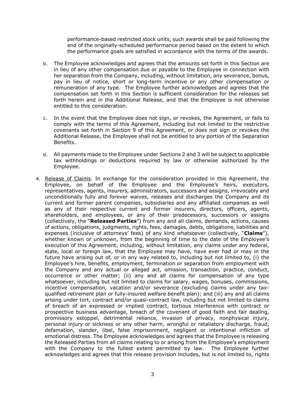 3 performance-based restricted stock units, such awards shall be paid following the end of the originally-scheduled performance period based on the extent to which the performance goals are satisfied in accordance with the terms of the awards. b. The Employee acknowledges and agrees that the amounts set forth in this Section are in lieu of any other compensation due or payable to the Employee in connection with her separation from the Company, including, without limitation, any severance, bonus, pay in lieu of notice, short or long-term incentive or any other compensation or remuneration of any type. The Employee further acknowledges and agrees that the compensation set forth in this Section is sufficient consideration for the releases set forth herein and in the Additional Release, and that the Employee is not otherwise entitled to this consideration. c. In the event that the Employee does not sign, or revokes, the Agreement, or fails to comply with the terms of this Agreement, including but not limited to the restrictive covenants set forth in Section 9 of this Agreement, or does not sign or revokes the Additional Release, the Employee shall not be entitled to any portion of the Separation Benefits. d. All payments made to the Employee under Sections 2 and 3 will be subject to applicable tax withholdings or deductions required by law or otherwise authorized by the Employee. 4. Release of Claims. In exchange for the consideration provided in this Agreement, the Employee, on behalf of the Employee and the Employee’s heirs, executors, representatives, agents, insurers, administrators, successors and assigns, irrevocably and unconditionally fully and forever waives, releases and discharges the Company and its current and former parent companies, subsidiaries and any affiliated companies as well as any of their respective current and former insurers, directors, officers, agents, shareholders, and employees, or any of their predecessors, successors or assigns (collectively, the “Released Parties”) from any and all claims, demands, actions, causes of actions, obligations, judgments, rights, fees, damages, debts, obligations, liabilities and expenses (inclusive of attorneys’ fees) of any kind whatsoever (collectively, “Claims”), whether known or unknown, from the beginning of time to the date of the Employee’s execution of this Agreement, including, without limitation, any claims under any federal, state, local or foreign law, that the Employee may have, have ever had or may in the future have arising out of, or in any way related to, including but not limited to, (i) the Employee’s hire, benefits, employment, termination or separation from employment with the Company and any actual or alleged act, omission, transaction, practice, conduct, occurrence or other matter; (ii) any and all claims for compensation of any type whatsoever, including but not limited to claims for salary, wages, bonuses, commissions, incentive compensation, vacation and/or severance (excluding claims under any tax- qualified retirement plan or fully-insured welfare benefit plan); and (iii) any and all claims arising under tort, contract and/or quasi-contract law, including but not limited to claims of breach of an expressed or implied contract, tortious interference with contract or prospective business advantage, breach of the covenant of good faith and fair dealing, promissory estoppel, detrimental reliance, invasion of privacy, nonphysical injury, personal injury or sickness or any other harm, wrongful or retaliatory discharge, fraud, defamation, slander, libel, false imprisonment, negligent or intentional infliction of emotional distress. The Employee acknowledges and agrees that the Employee is releasing the Released Parties from all claims relating to or arising from the Employee’s employment with the Company to the fullest extent permitted by law. The Employee further acknowledges and agrees that this release provision includes, but is not limited to, rights