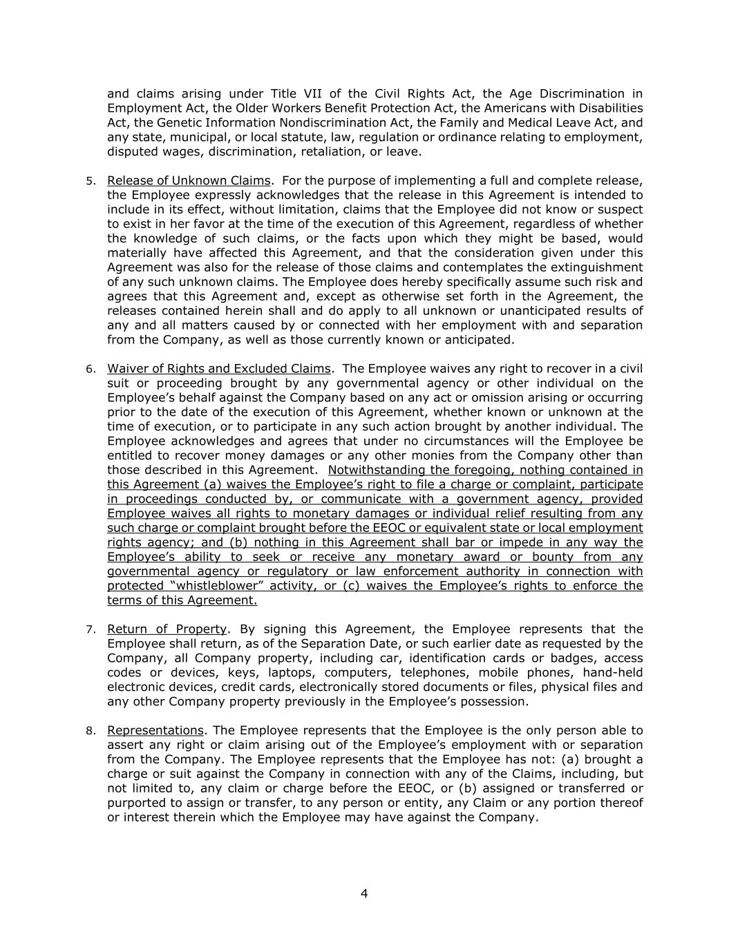 4 and claims arising under Title VII of the Civil Rights Act, the Age Discrimination in Employment Act, the Older Workers Benefit Protection Act, the Americans with Disabilities Act, the Genetic Information Nondiscrimination Act, the Family and Medical Leave Act, and any state, municipal, or local statute, law, regulation or ordinance relating to employment, disputed wages, discrimination, retaliation, or leave. 5. Release of Unknown Claims. For the purpose of implementing a full and complete release, the Employee expressly acknowledges that the release in this Agreement is intended to include in its effect, without limitation, claims that the Employee did not know or suspect to exist in her favor at the time of the execution of this Agreement, regardless of whether the knowledge of such claims, or the facts upon which they might be based, would materially have affected this Agreement, and that the consideration given under this Agreement was also for the release of those claims and contemplates the extinguishment of any such unknown claims. The Employee does hereby specifically assume such risk and agrees that this Agreement and, except as otherwise set forth in the Agreement, the releases contained herein shall and do apply to all unknown or unanticipated results of any and all matters caused by or connected with her employment with and separation from the Company, as well as those currently known or anticipated. 6. Waiver of Rights and Excluded Claims. The Employee waives any right to recover in a civil suit or proceeding brought by any governmental agency or other individual on the Employee’s behalf against the Company based on any act or omission arising or occurring prior to the date of the execution of this Agreement, whether known or unknown at the time of execution, or to participate in any such action brought by another individual. The Employee acknowledges and agrees that under no circumstances will the Employee be entitled to recover money damages or any other monies from the Company other than those described in this Agreement. Notwithstanding the foregoing, nothing contained in this Agreement (a) waives the Employee’s right to file a charge or complaint, participate in proceedings conducted by, or communicate with a government agency, provided Employee waives all rights to monetary damages or individual relief resulting from any such charge or complaint brought before the EEOC or equivalent state or local employment rights agency; and (b) nothing in this Agreement shall bar or impede in any way the Employee’s ability to seek or receive any monetary award or bounty from any governmental agency or regulatory or law enforcement authority in connection with protected “whistleblower” activity, or (c) waives the Employee’s rights to enforce the terms of this Agreement. 7. Return of Property. By signing this Agreement, the Employee represents that the Employee shall return, as of the Separation Date, or such earlier date as requested by the Company, all Company property, including car, identification cards or badges, access codes or devices, keys, laptops, computers, telephones, mobile phones, hand-held electronic devices, credit cards, electronically stored documents or files, physical files and any other Company property previously in the Employee’s possession. 8. Representations. The Employee represents that the Employee is the only person able to assert any right or claim arising out of the Employee’s employment with or separation from the Company. The Employee represents that the Employee has not: (a) brought a charge or suit against the Company in connection with any of the Claims, including, but not limited to, any claim or charge before the EEOC, or (b) assigned or transferred or purported to assign or transfer, to any person or entity, any Claim or any portion thereof or interest therein which the Employee may have against the Company.