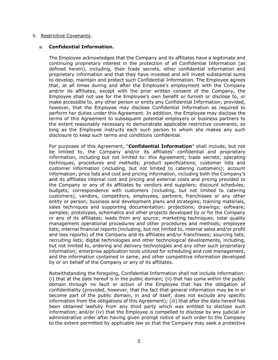 5 9. Restrictive Covenants. a. Confidential Information. The Employee acknowledges that the Company and its affiliates have a legitimate and continuing proprietary interest in the protection of all Confidential Information (as defined herein), including, their trade secrets, other confidential information and proprietary information and that they have invested and will invest substantial sums to develop, maintain and protect such Confidential Information. The Employee agrees that, at all times during and after the Employee’s employment with the Company and/or its affiliates, except with the prior written consent of the Company, the Employee shall not use for the Employee’s own benefit or furnish or disclose to, or make accessible to, any other person or entity any Confidential Information; provided, however, that the Employee may disclose Confidential Information as required to perform her duties under this Agreement. In addition, the Employee may disclose the terms of this Agreement to subsequent potential employers or business partners to the extent reasonably necessary to demonstrate applicable restrictive covenants, so long as the Employee instructs each such person to whom she makes any such disclosure to keep such terms and conditions confidential. For purposes of this Agreement, “Confidential Information” shall include, but not be limited to, the Company and/or its affiliates’ confidential and proprietary information, including but not limited to: this Agreement; trade secrets; operating techniques, procedures and methods; product specifications; customer lists and customer information (including, but not limited to catering customers); account information; price lists and cost and pricing information, including both the Company’s and its affiliates internal cost and pricing and external costs and pricing provided to the Company or any of its affiliates by vendors and suppliers; discount schedules; budgets; correspondence with customers (including, but not limited to catering customers), vendors, competitors, employees, partners, franchisees or any other entity or person; business and development plans and strategies; training materials, sales techniques and supporting documentation; projections; drawings; software; samples; prototypes, schematics and other projects developed by or for the Company or any of its affiliates; leads from any source; marketing techniques; total quality management operational procedures and other procedures and methods; employee lists; internal financial reports (including, but not limited to, internal sales and/or profit and loss reports) of the Company and its affiliates and/or franchisees; sourcing lists; recruiting lists; digital technologies and other technological developments, including, but not limited to, ordering and delivery technologies and any other such proprietary information; enterprise application tools utilized for scheduling and cost management, and the information contained in same; and other competitive information developed by or on behalf of the Company or any of its affiliates. Notwithstanding the foregoing, Confidential Information shall not include information: (i) that at the date hereof is in the public domain; (ii) that has come within the public domain through no fault or action of the Employee that has the obligation of confidentiality (provided, however, that the fact that general information may be in or become part of the public domain, in and of itself, does not exclude any specific information from the obligations of this Agreement); (iii) that after the date hereof has been obtained lawfully from any third party which was entitled to disclose such information; and/or (iv) that the Employee is compelled to disclose by any judicial or administrative order after having given prompt notice of such order to the Company to the extent permitted by applicable law so that the Company may seek a protective