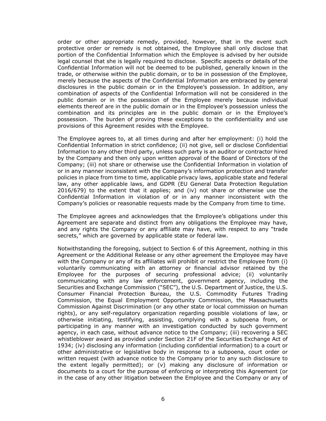 6 order or other appropriate remedy, provided, however, that in the event such protective order or remedy is not obtained, the Employee shall only disclose that portion of the Confidential Information which the Employee is advised by her outside legal counsel that she is legally required to disclose. Specific aspects or details of the Confidential Information will not be deemed to be published, generally known in the trade, or otherwise within the public domain, or to be in possession of the Employee, merely because the aspects of the Confidential Information are embraced by general disclosures in the public domain or in the Employee’s possession. In addition, any combination of aspects of the Confidential Information will not be considered in the public domain or in the possession of the Employee merely because individual elements thereof are in the public domain or in the Employee’s possession unless the combination and its principles are in the public domain or in the Employee’s possession. The burden of proving these exceptions to the confidentiality and use provisions of this Agreement resides with the Employee. The Employee agrees to, at all times during and after her employment: (i) hold the Confidential Information in strict confidence; (ii) not give, sell or disclose Confidential Information to any other third party, unless such party is an auditor or contractor hired by the Company and then only upon written approval of the Board of Directors of the Company; (iii) not share or otherwise use the Confidential Information in violation of or in any manner inconsistent with the Company’s information protection and transfer policies in place from time to time, applicable privacy laws, applicable state and federal law, any other applicable laws, and GDPR (EU General Data Protection Regulation 2016/679) to the extent that it applies; and (iv) not share or otherwise use the Confidential Information in violation of or in any manner inconsistent with the Company’s policies or reasonable requests made by the Company from time to time. The Employee agrees and acknowledges that the Employee’s obligations under this Agreement are separate and distinct from any obligations the Employee may have, and any rights the Company or any affiliate may have, with respect to any “trade secrets,” which are governed by applicable state or federal law. Notwithstanding the foregoing, subject to Section 6 of this Agreement, nothing in this Agreement or the Additional Release or any other agreement the Employee may have with the Company or any of its affiliates will prohibit or restrict the Employee from (i) voluntarily communicating with an attorney or financial advisor retained by the Employee for the purposes of securing professional advice; (ii) voluntarily communicating with any law enforcement, government agency, including the Securities and Exchange Commission (“SEC”), the U.S. Department of Justice, the U.S. Consumer Financial Protection Bureau, the U.S. Commodity Futures Trading Commission, the Equal Employment Opportunity Commission, the Massachusetts Commission Against Discrimination (or any other state or local commission on human rights), or any self-regulatory organization regarding possible violations of law, or otherwise initiating, testifying, assisting, complying with a subpoena from, or participating in any manner with an investigation conducted by such government agency, in each case, without advance notice to the Company; (iii) recovering a SEC whistleblower award as provided under Section 21F of the Securities Exchange Act of 1934; (iv) disclosing any information (including confidential information) to a court or other administrative or legislative body in response to a subpoena, court order or written request (with advance notice to the Company prior to any such disclosure to the extent legally permitted); or (v) making any disclosure of information or documents to a court for the purpose of enforcing or interpreting this Agreement (or in the case of any other litigation between the Employee and the Company or any of