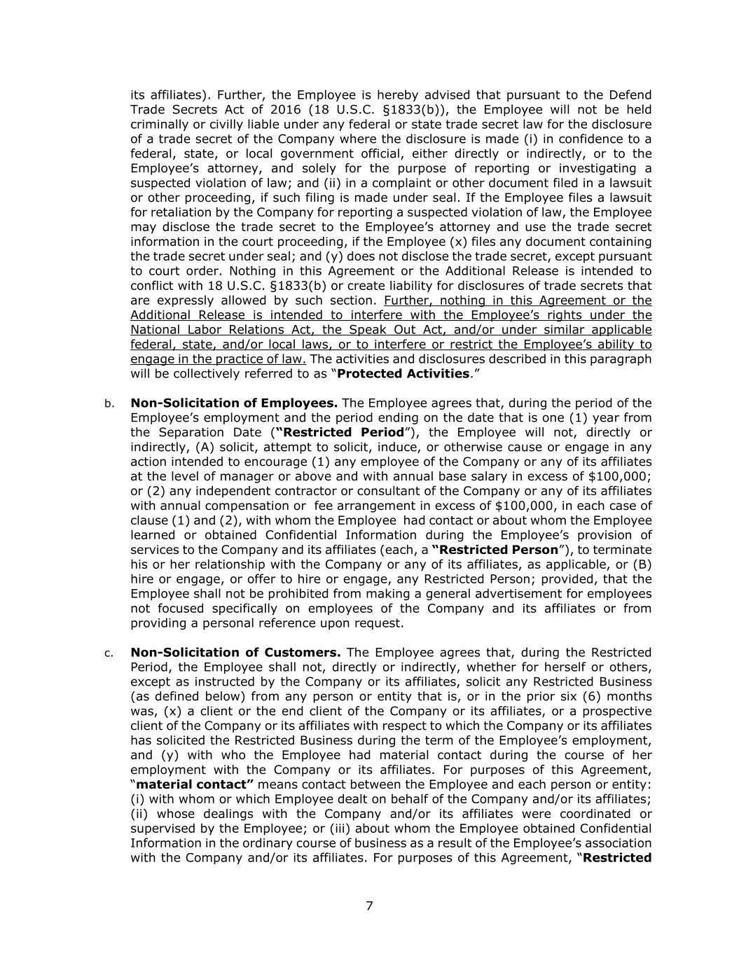 7 its affiliates). Further, the Employee is hereby advised that pursuant to the Defend Trade Secrets Act of 2016 (18 U.S.C. §1833(b)), the Employee will not be held criminally or civilly liable under any federal or state trade secret law for the disclosure of a trade secret of the Company where the disclosure is made (i) in confidence to a federal, state, or local government official, either directly or indirectly, or to the Employee’s attorney, and solely for the purpose of reporting or investigating a suspected violation of law; and (ii) in a complaint or other document filed in a lawsuit or other proceeding, if such filing is made under seal. If the Employee files a lawsuit for retaliation by the Company for reporting a suspected violation of law, the Employee may disclose the trade secret to the Employee’s attorney and use the trade secret information in the court proceeding, if the Employee (x) files any document containing the trade secret under seal; and (y) does not disclose the trade secret, except pursuant to court order. Nothing in this Agreement or the Additional Release is intended to conflict with 18 U.S.C. §1833(b) or create liability for disclosures of trade secrets that are expressly allowed by such section. Further, nothing in this Agreement or the Additional Release is intended to interfere with the Employee’s rights under the National Labor Relations Act, the Speak Out Act, and/or under similar applicable federal, state, and/or local laws, or to interfere or restrict the Employee’s ability to engage in the practice of law. The activities and disclosures described in this paragraph will be collectively referred to as “Protected Activities.” b. Non-Solicitation of Employees. The Employee agrees that, during the period of the Employee’s employment and the period ending on the date that is one (1) year from the Separation Date (“Restricted Period”), the Employee will not, directly or indirectly, (A) solicit, attempt to solicit, induce, or otherwise cause or engage in any action intended to encourage (1) any employee of the Company or any of its affiliates at the level of manager or above and with annual base salary in excess of $100,000; or (2) any independent contractor or consultant of the Company or any of its affiliates with annual compensation or fee arrangement in excess of $100,000, in each case of clause (1) and (2), with whom the Employee had contact or about whom the Employee learned or obtained Confidential Information during the Employee’s provision of services to the Company and its affiliates (each, a “Restricted Person”), to terminate his or her relationship with the Company or any of its affiliates, as applicable, or (B) hire or engage, or offer to hire or engage, any Restricted Person; provided, that the Employee shall not be prohibited from making a general advertisement for employees not focused specifically on employees of the Company and its affiliates or from providing a personal reference upon request. c. Non-Solicitation of Customers. The Employee agrees that, during the Restricted Period, the Employee shall not, directly or indirectly, whether for herself or others, except as instructed by the Company or its affiliates, solicit any Restricted Business (as defined below) from any person or entity that is, or in the prior six (6) months was, (x) a client or the end client of the Company or its affiliates, or a prospective client of the Company or its affiliates with respect to which the Company or its affiliates has solicited the Restricted Business during the term of the Employee’s employment, and (y) with who the Employee had material contact during the course of her employment with the Company or its affiliates. For purposes of this Agreement, “material contact” means contact between the Employee and each person or entity: (i) with whom or which Employee dealt on behalf of the Company and/or its affiliates; (ii) whose dealings with the Company and/or its affiliates were coordinated or supervised by the Employee; or (iii) about whom the Employee obtained Confidential Information in the ordinary course of business as a result of the Employee’s association with the Company and/or its affiliates. For purposes of this Agreement, “Restricted