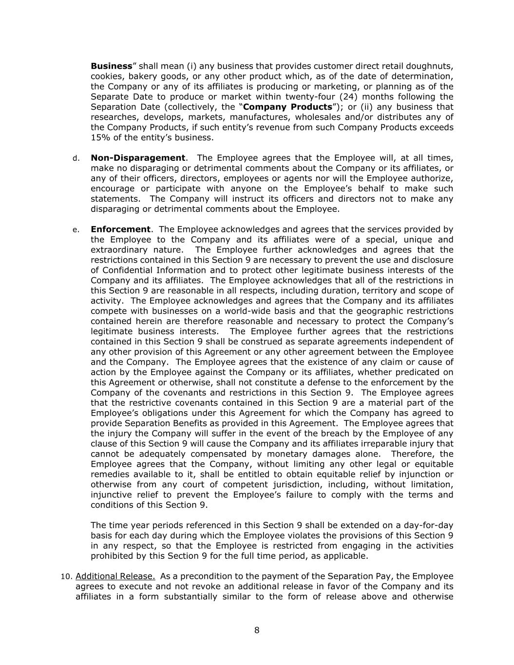 8 Business” shall mean (i) any business that provides customer direct retail doughnuts, cookies, bakery goods, or any other product which, as of the date of determination, the Company or any of its affiliates is producing or marketing, or planning as of the Separate Date to produce or market within twenty-four (24) months following the Separation Date (collectively, the “Company Products”); or (ii) any business that researches, develops, markets, manufactures, wholesales and/or distributes any of the Company Products, if such entity’s revenue from such Company Products exceeds 15% of the entity’s business. d. Non-Disparagement. The Employee agrees that the Employee will, at all times, make no disparaging or detrimental comments about the Company or its affiliates, or any of their officers, directors, employees or agents nor will the Employee authorize, encourage or participate with anyone on the Employee’s behalf to make such statements. The Company will instruct its officers and directors not to make any disparaging or detrimental comments about the Employee. e. Enforcement. The Employee acknowledges and agrees that the services provided by the Employee to the Company and its affiliates were of a special, unique and extraordinary nature. The Employee further acknowledges and agrees that the restrictions contained in this Section 9 are necessary to prevent the use and disclosure of Confidential Information and to protect other legitimate business interests of the Company and its affiliates. The Employee acknowledges that all of the restrictions in this Section 9 are reasonable in all respects, including duration, territory and scope of activity. The Employee acknowledges and agrees that the Company and its affiliates compete with businesses on a world-wide basis and that the geographic restrictions contained herein are therefore reasonable and necessary to protect the Company’s legitimate business interests. The Employee further agrees that the restrictions contained in this Section 9 shall be construed as separate agreements independent of any other provision of this Agreement or any other agreement between the Employee and the Company. The Employee agrees that the existence of any claim or cause of action by the Employee against the Company or its affiliates, whether predicated on this Agreement or otherwise, shall not constitute a defense to the enforcement by the Company of the covenants and restrictions in this Section 9. The Employee agrees that the restrictive covenants contained in this Section 9 are a material part of the Employee’s obligations under this Agreement for which the Company has agreed to provide Separation Benefits as provided in this Agreement. The Employee agrees that the injury the Company will suffer in the event of the breach by the Employee of any clause of this Section 9 will cause the Company and its affiliates irreparable injury that cannot be adequately compensated by monetary damages alone. Therefore, the Employee agrees that the Company, without limiting any other legal or equitable remedies available to it, shall be entitled to obtain equitable relief by injunction or otherwise from any court of competent jurisdiction, including, without limitation, injunctive relief to prevent the Employee’s failure to comply with the terms and conditions of this Section 9. The time year periods referenced in this Section 9 shall be extended on a day-for-day basis for each day during which the Employee violates the provisions of this Section 9 in any respect, so that the Employee is restricted from engaging in the activities prohibited by this Section 9 for the full time period, as applicable. 10. Additional Release. As a precondition to the payment of the Separation Pay, the Employee agrees to execute and not revoke an additional release in favor of the Company and its affiliates in a form substantially similar to the form of release above and otherwise