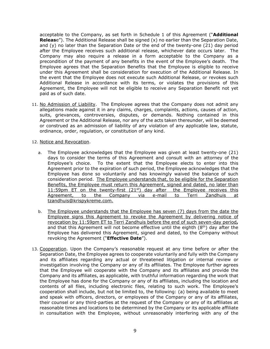 9 acceptable to the Company, as set forth in Schedule 1 of this Agreement (“Additional Release”). The Additional Release shall be signed (x) no earlier than the Separation Date, and (y) no later than the Separation Date or the end of the twenty-one (21) day period after the Employee receives such additional release, whichever date occurs later. The Company may also require a release in a form acceptable to the Company as a precondition of the payment of any benefits in the event of the Employee’s death. The Employee agrees that the Separation Benefits that the Employee is eligible to receive under this Agreement shall be consideration for execution of the Additional Release. In the event that the Employee does not execute such Additional Release, or revokes such Additional Release in accordance with its terms, or violates the provisions of this Agreement, the Employee will not be eligible to receive any Separation Benefit not yet paid as of such date. 11. No Admission of Liability. The Employee agrees that the Company does not admit any allegations made against it in any claims, charges, complaints, actions, causes of action, suits, grievances, controversies, disputes, or demands. Nothing contained in this Agreement or the Additional Release, nor any of the acts taken thereunder, will be deemed or construed as an admission of liability of any violation of any applicable law, statute, ordinance, order, regulation, or constitution of any kind. 12. Notice and Revocation. a. The Employee acknowledges that the Employee was given at least twenty-one (21) days to consider the terms of this Agreement and consult with an attorney of the Employee’s choice. To the extent that the Employee elects to enter into this Agreement prior to the expiration of such period, the Employee acknowledges that the Employee has done so voluntarily and has knowingly waived the balance of such consideration period. The Employee understands that, to be eligible for the Separation Benefits, the Employee must return this Agreement, signed and dated, no later than 11:59pm ET on the twenty-first (21st) day after the Employee receives this Agreement, to the Company via e-mail to Terri Zandhuis at tzandhuis@krispykreme.com. b. The Employee understands that the Employee has seven (7) days from the date the Employee signs this Agreement to revoke the Agreement by delivering notice of revocation by 11:59pm ET to Terri Zandhuis before the end of such seven-day period, and that this Agreement will not become effective until the eighth (8th) day after the Employee has delivered this Agreement, signed and dated, to the Company without revoking the Agreement (“Effective Date”). 13. Cooperation. Upon the Company’s reasonable request at any time before or after the Separation Date, the Employee agrees to cooperate voluntarily and fully with the Company and its affiliates regarding any actual or threatened litigation or internal review or investigation involving the Company or any of its affiliates. The Employee further agrees that the Employee will cooperate with the Company and its affiliates and provide the Company and its affiliates, as applicable, with truthful information regarding the work that the Employee has done for the Company or any of its affiliates, including the location and contents of all files, including electronic files, relating to such work. The Employee’s cooperation shall include, but not be limited to, the following: (a) being available to meet and speak with officers, directors, or employees of the Company or any of its affiliates, their counsel or any third-parties at the request of the Company or any of its affiliates at reasonable times and locations to be determined by the Company or its applicable affiliate in consultation with the Employee, without unreasonably interfering with any of the