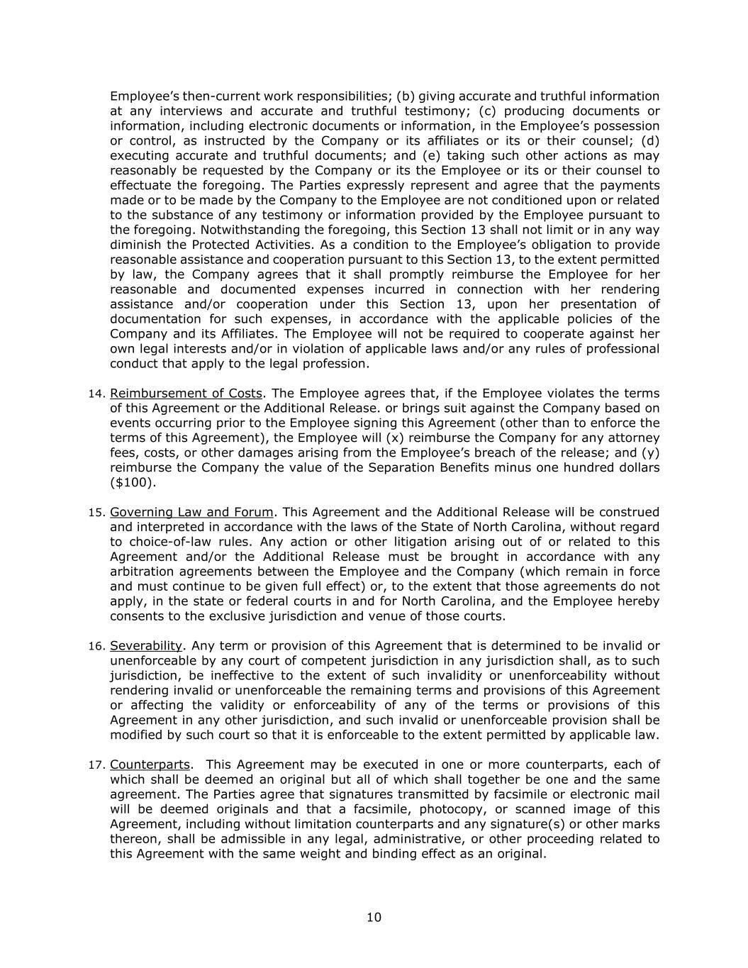 10 Employee’s then-current work responsibilities; (b) giving accurate and truthful information at any interviews and accurate and truthful testimony; (c) producing documents or information, including electronic documents or information, in the Employee’s possession or control, as instructed by the Company or its affiliates or its or their counsel; (d) executing accurate and truthful documents; and (e) taking such other actions as may reasonably be requested by the Company or its the Employee or its or their counsel to effectuate the foregoing. The Parties expressly represent and agree that the payments made or to be made by the Company to the Employee are not conditioned upon or related to the substance of any testimony or information provided by the Employee pursuant to the foregoing. Notwithstanding the foregoing, this Section 13 shall not limit or in any way diminish the Protected Activities. As a condition to the Employee’s obligation to provide reasonable assistance and cooperation pursuant to this Section 13, to the extent permitted by law, the Company agrees that it shall promptly reimburse the Employee for her reasonable and documented expenses incurred in connection with her rendering assistance and/or cooperation under this Section 13, upon her presentation of documentation for such expenses, in accordance with the applicable policies of the Company and its Affiliates. The Employee will not be required to cooperate against her own legal interests and/or in violation of applicable laws and/or any rules of professional conduct that apply to the legal profession. 14. Reimbursement of Costs. The Employee agrees that, if the Employee violates the terms of this Agreement or the Additional Release. or brings suit against the Company based on events occurring prior to the Employee signing this Agreement (other than to enforce the terms of this Agreement), the Employee will (x) reimburse the Company for any attorney fees, costs, or other damages arising from the Employee’s breach of the release; and (y) reimburse the Company the value of the Separation Benefits minus one hundred dollars ($100). 15. Governing Law and Forum. This Agreement and the Additional Release will be construed and interpreted in accordance with the laws of the State of North Carolina, without regard to choice-of-law rules. Any action or other litigation arising out of or related to this Agreement and/or the Additional Release must be brought in accordance with any arbitration agreements between the Employee and the Company (which remain in force and must continue to be given full effect) or, to the extent that those agreements do not apply, in the state or federal courts in and for North Carolina, and the Employee hereby consents to the exclusive jurisdiction and venue of those courts. 16. Severability. Any term or provision of this Agreement that is determined to be invalid or unenforceable by any court of competent jurisdiction in any jurisdiction shall, as to such jurisdiction, be ineffective to the extent of such invalidity or unenforceability without rendering invalid or unenforceable the remaining terms and provisions of this Agreement or affecting the validity or enforceability of any of the terms or provisions of this Agreement in any other jurisdiction, and such invalid or unenforceable provision shall be modified by such court so that it is enforceable to the extent permitted by applicable law. 17. Counterparts. This Agreement may be executed in one or more counterparts, each of which shall be deemed an original but all of which shall together be one and the same agreement. The Parties agree that signatures transmitted by facsimile or electronic mail will be deemed originals and that a facsimile, photocopy, or scanned image of this Agreement, including without limitation counterparts and any signature(s) or other marks thereon, shall be admissible in any legal, administrative, or other proceeding related to this Agreement with the same weight and binding effect as an original.