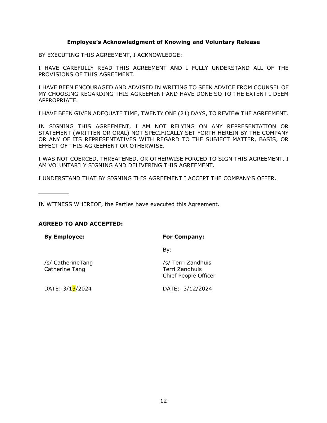 12 Employee’s Acknowledgment of Knowing and Voluntary Release BY EXECUTING THIS AGREEMENT, I ACKNOWLEDGE: I HAVE CAREFULLY READ THIS AGREEMENT AND I FULLY UNDERSTAND ALL OF THE PROVISIONS OF THIS AGREEMENT. I HAVE BEEN ENCOURAGED AND ADVISED IN WRITING TO SEEK ADVICE FROM COUNSEL OF MY CHOOSING REGARDING THIS AGREEMENT AND HAVE DONE SO TO THE EXTENT I DEEM APPROPRIATE. I HAVE BEEN GIVEN ADEQUATE TIME, TWENTY ONE (21) DAYS, TO REVIEW THE AGREEMENT. IN SIGNING THIS AGREEMENT, I AM NOT RELYING ON ANY REPRESENTATION OR STATEMENT (WRITTEN OR ORAL) NOT SPECIFICALLY SET FORTH HEREIN BY THE COMPANY OR ANY OF ITS REPRESENTATIVES WITH REGARD TO THE SUBJECT MATTER, BASIS, OR EFFECT OF THIS AGREEMENT OR OTHERWISE. I WAS NOT COERCED, THREATENED, OR OTHERWISE FORCED TO SIGN THIS AGREEMENT. I AM VOLUNTARILY SIGNING AND DELIVERING THIS AGREEMENT. I UNDERSTAND THAT BY SIGNING THIS AGREEMENT I ACCEPT THE COMPANY’S OFFER. _________ IN WITNESS WHEREOF, the Parties have executed this Agreement. AGREED TO AND ACCEPTED: By Employee: /s/ CatherineTang Catherine Tang DATE: 3/13/2024 For Company: By: /s/ Terri Zandhuis Terri Zandhuis Chief People Officer DATE: 3/12/2024