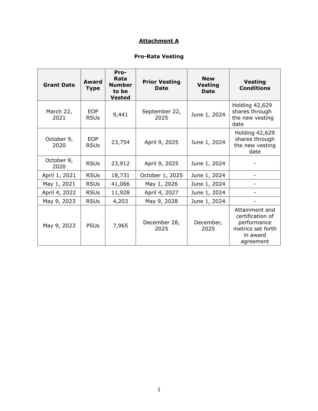 1 Attachment A Pro-Rata Vesting Grant Date Award Type Pro- Rata Number to be Vested Prior Vesting Date New Vesting Date Vesting Conditions March 22, 2021 EOP RSUs 9,441 September 22, 2025 June 1, 2024 Holding 42,629 shares through the new vesting date October 9, 2020 EOP RSUs 23,754 April 9, 2025 June 1, 2024 Holding 42,629 shares through the new vesting date October 9, 2020 RSUs 23,912 April 9, 2025 June 1, 2024 - April 1, 2021 RSUs 18,731 October 1, 2025 June 1, 2024 - May 1, 2021 RSUs 41,066 May 1, 2026 June 1, 2024 - April 4, 2022 RSUs 11,928 April 4, 2027 June 1, 2024 - May 9, 2023 RSUs 4,203 May 9, 2028 June 1, 2024 - May 9, 2023 PSUs 7,965 December 28, 2025 December, 2025 Attainment and certification of performance metrics set forth in award agreement