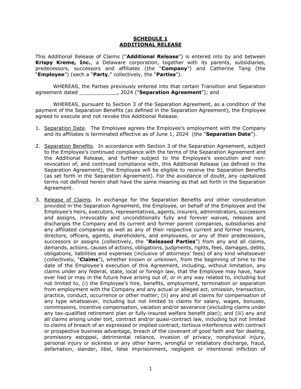 1 SCHEDULE 1 ADDITIONAL RELEASE This Additional Release of Claims (“Additional Release”) is entered into by and between Krispy Kreme, Inc., a Delaware corporation, together with its parents, subsidiaries, predecessors, successors and affiliates (the “Company”) and Catherine Tang (the “Employee”) (each a “Party,” collectively, the “Parties”). WHEREAS, the Parties previously entered into that certain Transition and Separation agreement dated ____________, 2024 (“Separation Agreement”); and WHEREAS, pursuant to Section 3 of the Separation Agreement, as a condition of the payment of the Separation Benefits (as defined in the Separation Agreement), the Employee agreed to execute and not revoke this Additional Release. 1. Separation Date. The Employee agrees the Employee’s employment with the Company and its affiliates is terminated effective as of June 1, 2024 (the “Separation Date”). 2. Separation Benefits. In accordance with Section 3 of the Separation Agreement, subject to the Employee’s continued compliance with the terms of the Separation Agreement and the Additional Release, and further subject to the Employee’s execution and non- revocation of, and continued compliance with, this Additional Release (as defined in the Separation Agreement), the Employee will be eligible to receive the Separation Benefits (as set forth in the Separation Agreement). For the avoidance of doubt, any capitalized terms not defined herein shall have the same meaning as that set forth in the Separation Agreement. 3. Release of Claims. In exchange for the Separation Benefits and other consideration provided in the Separation Agreement, the Employee, on behalf of the Employee and the Employee’s heirs, executors, representatives, agents, insurers, administrators, successors and assigns, irrevocably and unconditionally fully and forever waives, releases and discharges the Company and its current and former parent companies, subsidiaries and any affiliated companies as well as any of their respective current and former insurers, directors, officers, agents, shareholders, and employees, or any of their predecessors, successors or assigns (collectively, the “Released Parties”) from any and all claims, demands, actions, causes of actions, obligations, judgments, rights, fees, damages, debts, obligations, liabilities and expenses (inclusive of attorneys’ fees) of any kind whatsoever (collectively, “Claims”), whether known or unknown, from the beginning of time to the date of the Employee’s execution of this Agreement, including, without limitation, any claims under any federal, state, local or foreign law, that the Employee may have, have ever had or may in the future have arising out of, or in any way related to, including but not limited to, (i) the Employee’s hire, benefits, employment, termination or separation from employment with the Company and any actual or alleged act, omission, transaction, practice, conduct, occurrence or other matter; (ii) any and all claims for compensation of any type whatsoever, including but not limited to claims for salary, wages, bonuses, commissions, incentive compensation, vacation and/or severance (excluding claims under any tax-qualified retirement plan or fully-insured welfare benefit plan); and (iii) any and all claims arising under tort, contract and/or quasi-contract law, including but not limited to claims of breach of an expressed or implied contract, tortious interference with contract or prospective business advantage, breach of the covenant of good faith and fair dealing, promissory estoppel, detrimental reliance, invasion of privacy, nonphysical injury, personal injury or sickness or any other harm, wrongful or retaliatory discharge, fraud, defamation, slander, libel, false imprisonment, negligent or intentional infliction of