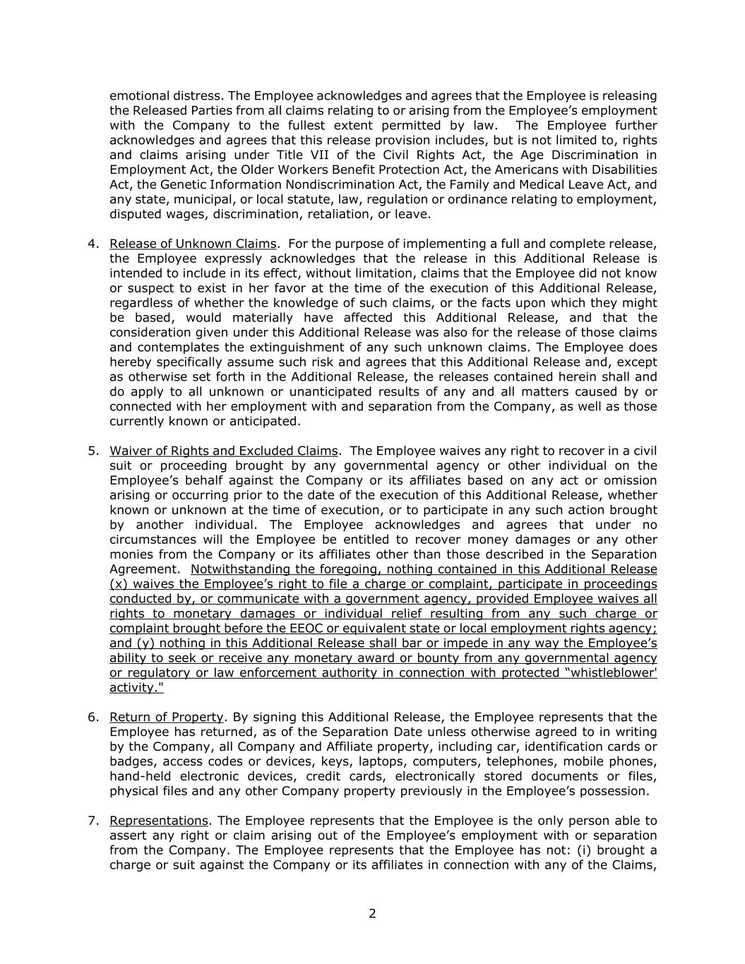 2 emotional distress. The Employee acknowledges and agrees that the Employee is releasing the Released Parties from all claims relating to or arising from the Employee’s employment with the Company to the fullest extent permitted by law. The Employee further acknowledges and agrees that this release provision includes, but is not limited to, rights and claims arising under Title VII of the Civil Rights Act, the Age Discrimination in Employment Act, the Older Workers Benefit Protection Act, the Americans with Disabilities Act, the Genetic Information Nondiscrimination Act, the Family and Medical Leave Act, and any state, municipal, or local statute, law, regulation or ordinance relating to employment, disputed wages, discrimination, retaliation, or leave. 4. Release of Unknown Claims. For the purpose of implementing a full and complete release, the Employee expressly acknowledges that the release in this Additional Release is intended to include in its effect, without limitation, claims that the Employee did not know or suspect to exist in her favor at the time of the execution of this Additional Release, regardless of whether the knowledge of such claims, or the facts upon which they might be based, would materially have affected this Additional Release, and that the consideration given under this Additional Release was also for the release of those claims and contemplates the extinguishment of any such unknown claims. The Employee does hereby specifically assume such risk and agrees that this Additional Release and, except as otherwise set forth in the Additional Release, the releases contained herein shall and do apply to all unknown or unanticipated results of any and all matters caused by or connected with her employment with and separation from the Company, as well as those currently known or anticipated. 5. Waiver of Rights and Excluded Claims. The Employee waives any right to recover in a civil suit or proceeding brought by any governmental agency or other individual on the Employee’s behalf against the Company or its affiliates based on any act or omission arising or occurring prior to the date of the execution of this Additional Release, whether known or unknown at the time of execution, or to participate in any such action brought by another individual. The Employee acknowledges and agrees that under no circumstances will the Employee be entitled to recover money damages or any other monies from the Company or its affiliates other than those described in the Separation Agreement. Notwithstanding the foregoing, nothing contained in this Additional Release (x) waives the Employee’s right to file a charge or complaint, participate in proceedings conducted by, or communicate with a government agency, provided Employee waives all rights to monetary damages or individual relief resulting from any such charge or complaint brought before the EEOC or equivalent state or local employment rights agency; and (y) nothing in this Additional Release shall bar or impede in any way the Employee’s ability to seek or receive any monetary award or bounty from any governmental agency or regulatory or law enforcement authority in connection with protected “whistleblower' activity." 6. Return of Property. By signing this Additional Release, the Employee represents that the Employee has returned, as of the Separation Date unless otherwise agreed to in writing by the Company, all Company and Affiliate property, including car, identification cards or badges, access codes or devices, keys, laptops, computers, telephones, mobile phones, hand-held electronic devices, credit cards, electronically stored documents or files, physical files and any other Company property previously in the Employee’s possession. 7. Representations. The Employee represents that the Employee is the only person able to assert any right or claim arising out of the Employee’s employment with or separation from the Company. The Employee represents that the Employee has not: (i) brought a charge or suit against the Company or its affiliates in connection with any of the Claims,