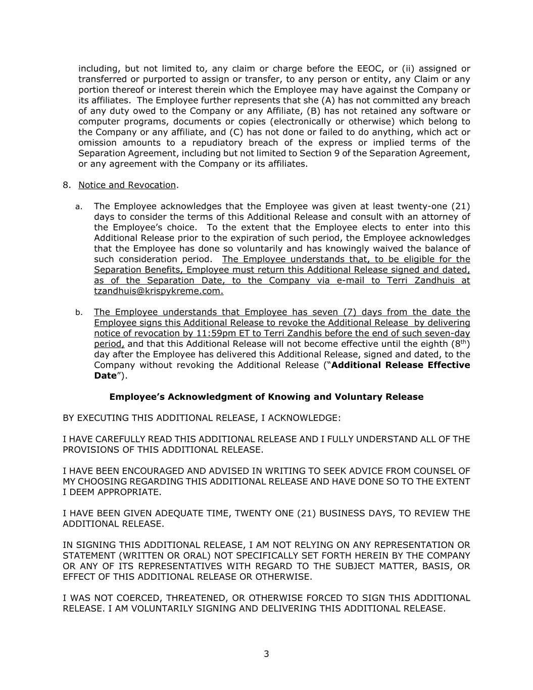 3 including, but not limited to, any claim or charge before the EEOC, or (ii) assigned or transferred or purported to assign or transfer, to any person or entity, any Claim or any portion thereof or interest therein which the Employee may have against the Company or its affiliates. The Employee further represents that she (A) has not committed any breach of any duty owed to the Company or any Affiliate, (B) has not retained any software or computer programs, documents or copies (electronically or otherwise) which belong to the Company or any affiliate, and (C) has not done or failed to do anything, which act or omission amounts to a repudiatory breach of the express or implied terms of the Separation Agreement, including but not limited to Section 9 of the Separation Agreement, or any agreement with the Company or its affiliates. 8. Notice and Revocation. a. The Employee acknowledges that the Employee was given at least twenty-one (21) days to consider the terms of this Additional Release and consult with an attorney of the Employee’s choice. To the extent that the Employee elects to enter into this Additional Release prior to the expiration of such period, the Employee acknowledges that the Employee has done so voluntarily and has knowingly waived the balance of such consideration period. The Employee understands that, to be eligible for the Separation Benefits, Employee must return this Additional Release signed and dated, as of the Separation Date, to the Company via e-mail to Terri Zandhuis at tzandhuis@krispykreme.com. b. The Employee understands that Employee has seven (7) days from the date the Employee signs this Additional Release to revoke the Additional Release by delivering notice of revocation by 11:59pm ET to Terri Zandhis before the end of such seven-day period, and that this Additional Release will not become effective until the eighth (8th) day after the Employee has delivered this Additional Release, signed and dated, to the Company without revoking the Additional Release (“Additional Release Effective Date”). Employee’s Acknowledgment of Knowing and Voluntary Release BY EXECUTING THIS ADDITIONAL RELEASE, I ACKNOWLEDGE: I HAVE CAREFULLY READ THIS ADDITIONAL RELEASE AND I FULLY UNDERSTAND ALL OF THE PROVISIONS OF THIS ADDITIONAL RELEASE. I HAVE BEEN ENCOURAGED AND ADVISED IN WRITING TO SEEK ADVICE FROM COUNSEL OF MY CHOOSING REGARDING THIS ADDITIONAL RELEASE AND HAVE DONE SO TO THE EXTENT I DEEM APPROPRIATE. I HAVE BEEN GIVEN ADEQUATE TIME, TWENTY ONE (21) BUSINESS DAYS, TO REVIEW THE ADDITIONAL RELEASE. IN SIGNING THIS ADDITIONAL RELEASE, I AM NOT RELYING ON ANY REPRESENTATION OR STATEMENT (WRITTEN OR ORAL) NOT SPECIFICALLY SET FORTH HEREIN BY THE COMPANY OR ANY OF ITS REPRESENTATIVES WITH REGARD TO THE SUBJECT MATTER, BASIS, OR EFFECT OF THIS ADDITIONAL RELEASE OR OTHERWISE. I WAS NOT COERCED, THREATENED, OR OTHERWISE FORCED TO SIGN THIS ADDITIONAL RELEASE. I AM VOLUNTARILY SIGNING AND DELIVERING THIS ADDITIONAL RELEASE.
