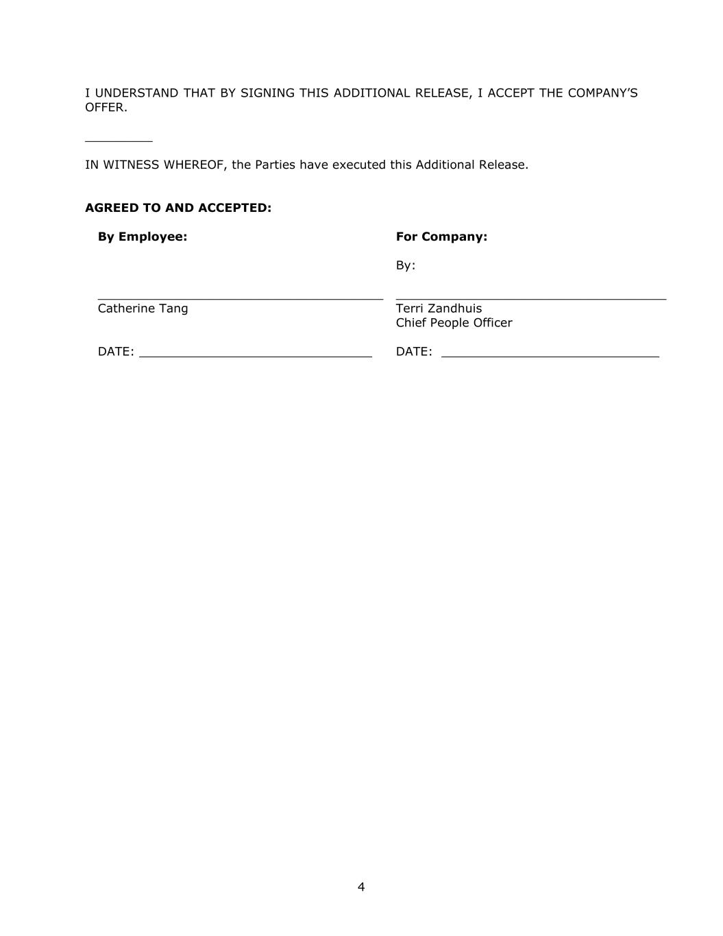 4 I UNDERSTAND THAT BY SIGNING THIS ADDITIONAL RELEASE, I ACCEPT THE COMPANY’S OFFER. _________ IN WITNESS WHEREOF, the Parties have executed this Additional Release. AGREED TO AND ACCEPTED: By Employee: ______________________________________ Catherine Tang DATE: _______________________________ For Company: By: ____________________________________ Terri Zandhuis Chief People Officer DATE: _____________________________
