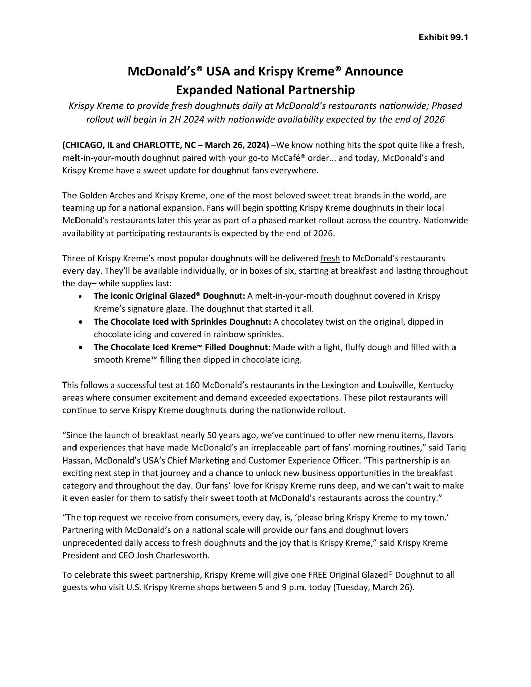 Exhibit 99.1 McDonald’s® USA and Krispy Kreme® Announce Expanded Na�onal Partnership Krispy Kreme to provide fresh doughnuts daily at McDonald’s restaurants nationwide; Phased rollout will begin in 2H 2024 with nationwide availability expected by the end of 2026 (CHICAGO, IL and CHARLOTTE, NC – March 26, 2024) –We know nothing hits the spot quite like a fresh, melt-in-your-mouth doughnut paired with your go-to McCafé® order... and today, McDonald’s and Krispy Kreme have a sweet update for doughnut fans everywhere. The Golden Arches and Krispy Kreme, one of the most beloved sweet treat brands in the world, are teaming up for a na�onal expansion. Fans will begin spo�ng Krispy Kreme doughnuts in their local McDonald’s restaurants later this year as part of a phased market rollout across the country. Na�onwide availability at par�cipa�ng restaurants is expected by the end of 2026. Three of Krispy Kreme’s most popular doughnuts will be delivered fresh to McDonald’s restaurants every day. They’ll be available individually, or in boxes of six, star�ng at breakfast and las�ng throughout the day– while supplies last: • The iconic Original Glazed® Doughnut: A melt-in-your-mouth doughnut covered in Krispy Kreme’s signature glaze. The doughnut that started it all. • The Chocolate Iced with Sprinkles Doughnut: A chocolatey twist on the original, dipped in chocolate icing and covered in rainbow sprinkles. • The Chocolate Iced Kreme™ Filled Doughnut: Made with a light, fluffy dough and filled with a smooth Kreme™ filling then dipped in chocolate icing. This follows a successful test at 160 McDonald’s restaurants in the Lexington and Louisville, Kentucky areas where consumer excitement and demand exceeded expecta�ons. These pilot restaurants will con�nue to serve Krispy Kreme doughnuts during the na�onwide rollout. “Since the launch of breakfast nearly 50 years ago, we’ve con�nued to offer new menu items, flavors and experiences that have made McDonald’s an irreplaceable part of fans’ morning rou�nes,” said Tariq Hassan, McDonald’s USA’s Chief Marke�ng and Customer Experience Officer. “This partnership is an exci�ng next step in that journey and a chance to unlock new business opportuni�es in the breakfast category and throughout the day. Our fans’ love for Krispy Kreme runs deep, and we can’t wait to make it even easier for them to sa�sfy their sweet tooth at McDonald’s restaurants across the country.” “The top request we receive from consumers, every day, is, ‘please bring Krispy Kreme to my town.’ Partnering with McDonald’s on a na�onal scale will provide our fans and doughnut lovers unprecedented daily access to fresh doughnuts and the joy that is Krispy Kreme,” said Krispy Kreme President and CEO Josh Charlesworth. To celebrate this sweet partnership, Krispy Kreme will give one FREE Original Glazed® Doughnut to all guests who visit U.S. Krispy Kreme shops between 5 and 9 p.m. today (Tuesday, March 26).