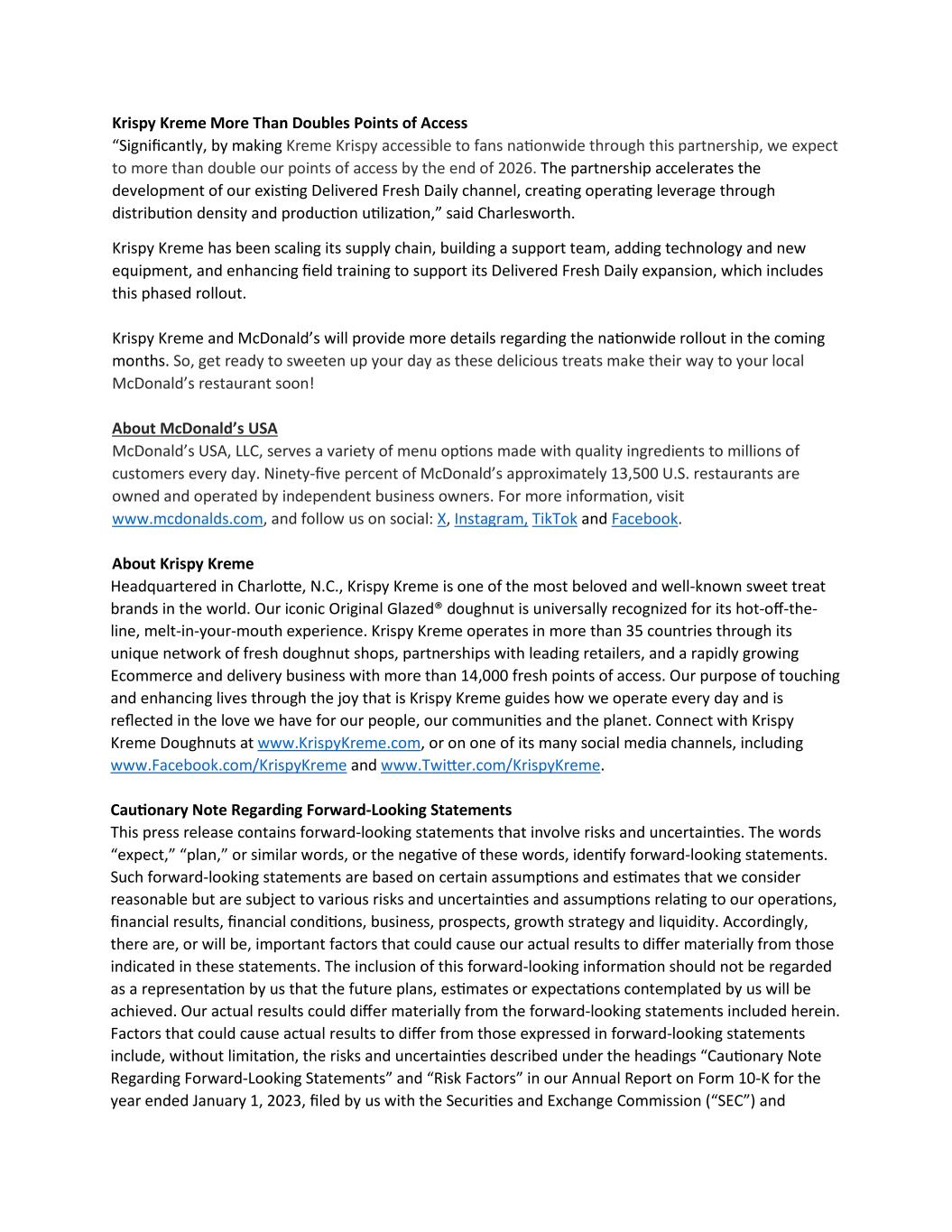 Krispy Kreme More Than Doubles Points of Access “Significantly, by making Kreme Krispy accessible to fans na�onwide through this partnership, we expect to more than double our points of access by the end of 2026. The partnership accelerates the development of our exis�ng Delivered Fresh Daily channel, crea�ng opera�ng leverage through distribu�on density and produc�on u�liza�on,” said Charlesworth. Krispy Kreme has been scaling its supply chain, building a support team, adding technology and new equipment, and enhancing field training to support its Delivered Fresh Daily expansion, which includes this phased rollout. Krispy Kreme and McDonald’s will provide more details regarding the na�onwide rollout in the coming months. So, get ready to sweeten up your day as these delicious treats make their way to your local McDonald’s restaurant soon! About McDonald’s USA McDonald’s USA, LLC, serves a variety of menu op�ons made with quality ingredients to millions of customers every day. Ninety-five percent of McDonald’s approximately 13,500 U.S. restaurants are owned and operated by independent business owners. For more informa�on, visit www.mcdonalds.com, and follow us on social: X, Instagram, TikTok and Facebook. About Krispy Kreme Headquartered in Charlote, N.C., Krispy Kreme is one of the most beloved and well-known sweet treat brands in the world. Our iconic Original Glazed® doughnut is universally recognized for its hot-off-the- line, melt-in-your-mouth experience. Krispy Kreme operates in more than 35 countries through its unique network of fresh doughnut shops, partnerships with leading retailers, and a rapidly growing Ecommerce and delivery business with more than 14,000 fresh points of access. Our purpose of touching and enhancing lives through the joy that is Krispy Kreme guides how we operate every day and is reflected in the love we have for our people, our communi�es and the planet. Connect with Krispy Kreme Doughnuts at www.KrispyKreme.com, or on one of its many social media channels, including www.Facebook.com/KrispyKreme and www.Twiter.com/KrispyKreme. Cau�onary Note Regarding Forward-Looking Statements This press release contains forward-looking statements that involve risks and uncertain�es. The words “expect,” “plan,” or similar words, or the nega�ve of these words, iden�fy forward-looking statements. Such forward-looking statements are based on certain assump�ons and es�mates that we consider reasonable but are subject to various risks and uncertain�es and assump�ons rela�ng to our opera�ons, financial results, financial condi�ons, business, prospects, growth strategy and liquidity. Accordingly, there are, or will be, important factors that could cause our actual results to differ materially from those indicated in these statements. The inclusion of this forward-looking informa�on should not be regarded as a representa�on by us that the future plans, es�mates or expecta�ons contemplated by us will be achieved. Our actual results could differ materially from the forward-looking statements included herein. Factors that could cause actual results to differ from those expressed in forward-looking statements include, without limita�on, the risks and uncertain�es described under the headings “Cau�onary Note Regarding Forward-Looking Statements” and “Risk Factors” in our Annual Report on Form 10-K for the year ended January 1, 2023, filed by us with the Securi�es and Exchange Commission (“SEC”) and