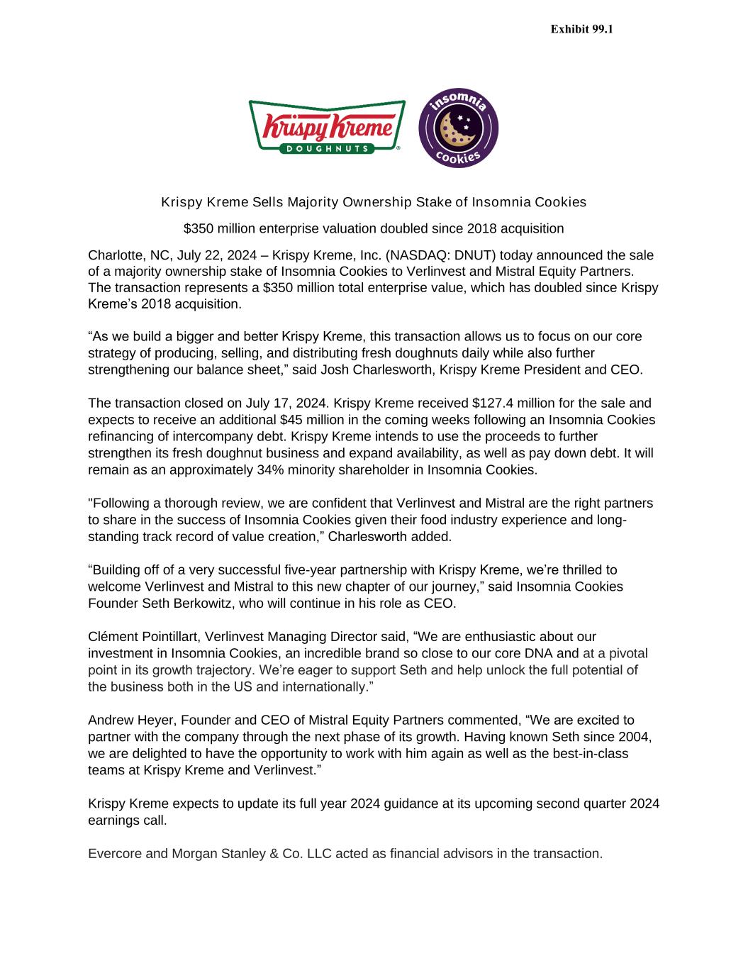 Krispy Kreme Sells Majority Ownership Stake of Insomnia Cookies $350 million enterprise valuation doubled since 2018 acquisition Charlotte, NC, July 22, 2024 – Krispy Kreme, Inc. (NASDAQ: DNUT) today announced the sale of a majority ownership stake of Insomnia Cookies to Verlinvest and Mistral Equity Partners. The transaction represents a $350 million total enterprise value, which has doubled since Krispy Kreme’s 2018 acquisition. “As we build a bigger and better Krispy Kreme, this transaction allows us to focus on our core strategy of producing, selling, and distributing fresh doughnuts daily while also further strengthening our balance sheet,” said Josh Charlesworth, Krispy Kreme President and CEO. The transaction closed on July 17, 2024. Krispy Kreme received $127.4 million for the sale and expects to receive an additional $45 million in the coming weeks following an Insomnia Cookies refinancing of intercompany debt. Krispy Kreme intends to use the proceeds to further strengthen its fresh doughnut business and expand availability, as well as pay down debt. It will remain as an approximately 34% minority shareholder in Insomnia Cookies. "Following a thorough review, we are confident that Verlinvest and Mistral are the right partners to share in the success of Insomnia Cookies given their food industry experience and long- standing track record of value creation,” Charlesworth added. “Building off of a very successful five-year partnership with Krispy Kreme, we’re thrilled to welcome Verlinvest and Mistral to this new chapter of our journey,” said Insomnia Cookies Founder Seth Berkowitz, who will continue in his role as CEO. Clément Pointillart, Verlinvest Managing Director said, “We are enthusiastic about our investment in Insomnia Cookies, an incredible brand so close to our core DNA and at a pivotal point in its growth trajectory. We’re eager to support Seth and help unlock the full potential of the business both in the US and internationally.” Andrew Heyer, Founder and CEO of Mistral Equity Partners commented, “We are excited to partner with the company through the next phase of its growth. Having known Seth since 2004, we are delighted to have the opportunity to work with him again as well as the best-in-class teams at Krispy Kreme and Verlinvest.” Krispy Kreme expects to update its full year 2024 guidance at its upcoming second quarter 2024 earnings call. Evercore and Morgan Stanley & Co. LLC acted as financial advisors in the transaction. Exhibit 99.1