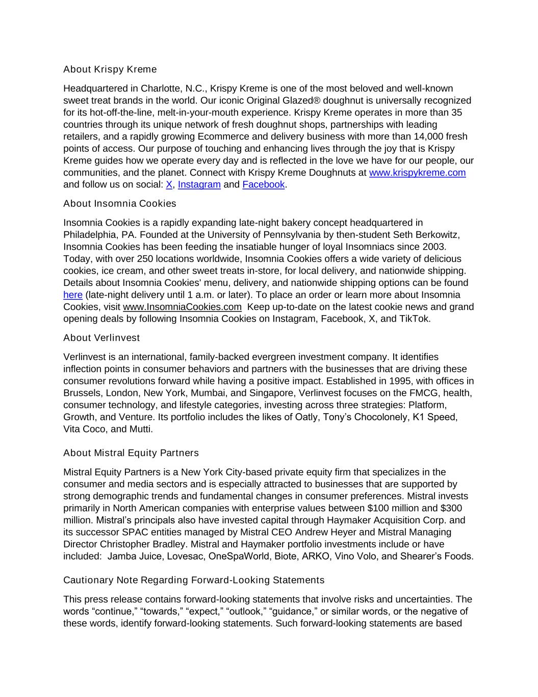 About Krispy Kreme Headquartered in Charlotte, N.C., Krispy Kreme is one of the most beloved and well-known sweet treat brands in the world. Our iconic Original Glazed® doughnut is universally recognized for its hot-off-the-line, melt-in-your-mouth experience. Krispy Kreme operates in more than 35 countries through its unique network of fresh doughnut shops, partnerships with leading retailers, and a rapidly growing Ecommerce and delivery business with more than 14,000 fresh points of access. Our purpose of touching and enhancing lives through the joy that is Krispy Kreme guides how we operate every day and is reflected in the love we have for our people, our communities, and the planet. Connect with Krispy Kreme Doughnuts at www.krispykreme.com and follow us on social: X, Instagram and Facebook. About Insomnia Cookies Insomnia Cookies is a rapidly expanding late-night bakery concept headquartered in Philadelphia, PA. Founded at the University of Pennsylvania by then-student Seth Berkowitz, Insomnia Cookies has been feeding the insatiable hunger of loyal Insomniacs since 2003. Today, with over 250 locations worldwide, Insomnia Cookies offers a wide variety of delicious cookies, ice cream, and other sweet treats in-store, for local delivery, and nationwide shipping. Details about Insomnia Cookies' menu, delivery, and nationwide shipping options can be found here (late-night delivery until 1 a.m. or later). To place an order or learn more about Insomnia Cookies, visit www.InsomniaCookies.com Keep up-to-date on the latest cookie news and grand opening deals by following Insomnia Cookies on Instagram, Facebook, X, and TikTok. About Verlinvest Verlinvest is an international, family-backed evergreen investment company. It identifies inflection points in consumer behaviors and partners with the businesses that are driving these consumer revolutions forward while having a positive impact. Established in 1995, with offices in Brussels, London, New York, Mumbai, and Singapore, Verlinvest focuses on the FMCG, health, consumer technology, and lifestyle categories, investing across three strategies: Platform, Growth, and Venture. Its portfolio includes the likes of Oatly, Tony’s Chocolonely, K1 Speed, Vita Coco, and Mutti. About Mistral Equity Partners Mistral Equity Partners is a New York City-based private equity firm that specializes in the consumer and media sectors and is especially attracted to businesses that are supported by strong demographic trends and fundamental changes in consumer preferences. Mistral invests primarily in North American companies with enterprise values between $100 million and $300 million. Mistral’s principals also have invested capital through Haymaker Acquisition Corp. and its successor SPAC entities managed by Mistral CEO Andrew Heyer and Mistral Managing Director Christopher Bradley. Mistral and Haymaker portfolio investments include or have included: Jamba Juice, Lovesac, OneSpaWorld, Biote, ARKO, Vino Volo, and Shearer’s Foods. Cautionary Note Regarding Forward-Looking Statements This press release contains forward-looking statements that involve risks and uncertainties. The words “continue,” “towards,” “expect,” “outlook,” “guidance,” or similar words, or the negative of these words, identify forward-looking statements. Such forward-looking statements are based