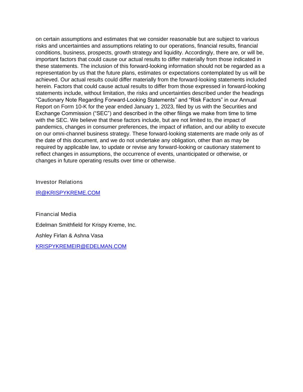 on certain assumptions and estimates that we consider reasonable but are subject to various risks and uncertainties and assumptions relating to our operations, financial results, financial conditions, business, prospects, growth strategy and liquidity. Accordingly, there are, or will be, important factors that could cause our actual results to differ materially from those indicated in these statements. The inclusion of this forward-looking information should not be regarded as a representation by us that the future plans, estimates or expectations contemplated by us will be achieved. Our actual results could differ materially from the forward-looking statements included herein. Factors that could cause actual results to differ from those expressed in forward-looking statements include, without limitation, the risks and uncertainties described under the headings “Cautionary Note Regarding Forward-Looking Statements” and “Risk Factors” in our Annual Report on Form 10-K for the year ended January 1, 2023, filed by us with the Securities and Exchange Commission (“SEC”) and described in the other filings we make from time to time with the SEC. We believe that these factors include, but are not limited to, the impact of pandemics, changes in consumer preferences, the impact of inflation, and our ability to execute on our omni-channel business strategy. These forward-looking statements are made only as of the date of this document, and we do not undertake any obligation, other than as may be required by applicable law, to update or revise any forward-looking or cautionary statement to reflect changes in assumptions, the occurrence of events, unanticipated or otherwise, or changes in future operating results over time or otherwise. Investor Relations IR@KRISPYKREME.COM Financial Media Edelman Smithfield for Krispy Kreme, Inc. Ashley Firlan & Ashna Vasa KRISPYKREMEIR@EDELMAN.COM