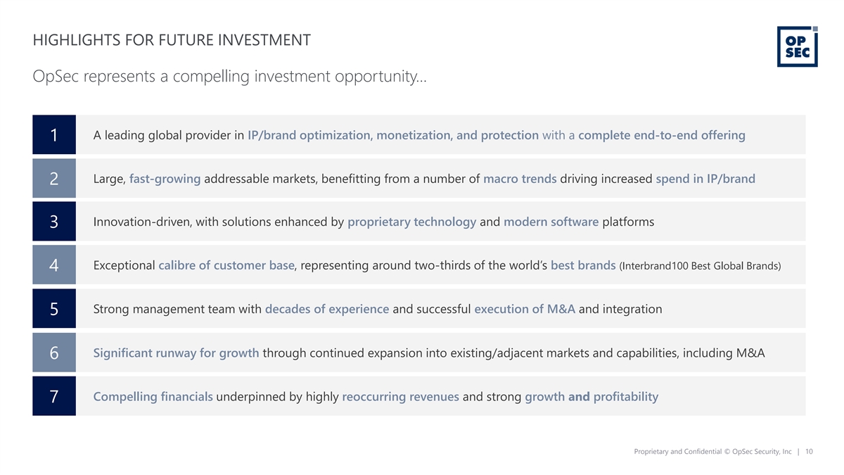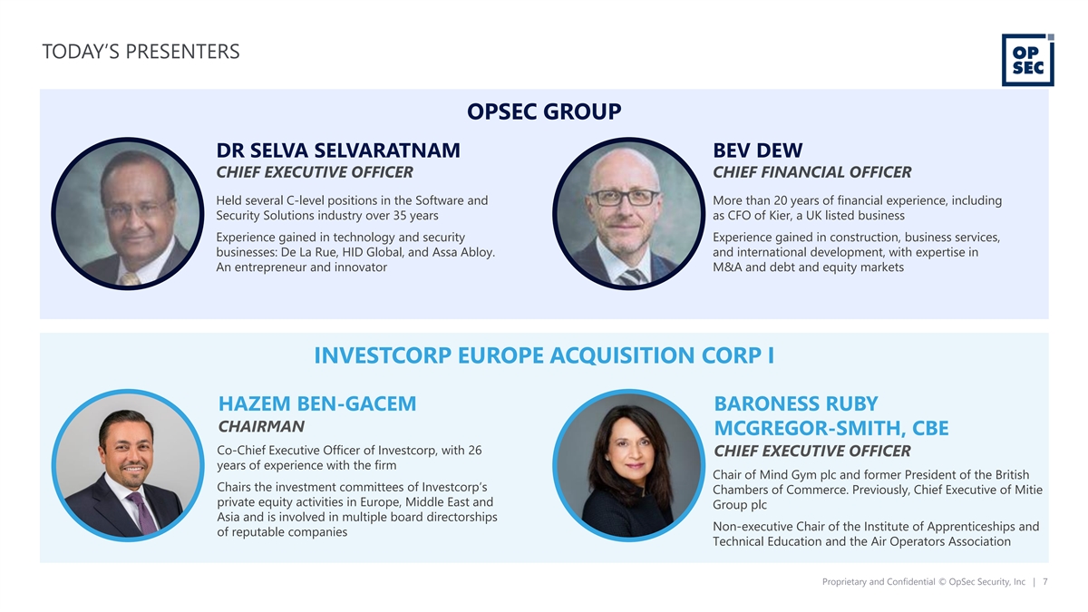 DISCLAIMER (5/5) Additional Information In connection with the proposed Business Combination, Pubco intends to file with the SEC a registration statement on Form F-4 containing a preliminary proxy statement/prospectus of Pubco, and after the registration statement is declared effective, Investcorp will mail a definitive proxy statement/prospectus relating to the proposed Business Combination to its shareholders. This Presentation does not contain all the information that should be considered concerning the proposed Business Combination and is not intended to form the basis of any investment decision or any other decision in respect of the Business Combination. Investcorp’s shareholders and other interested persons are advised to read, when available, the preliminary proxy statement/prospectus and the amendments thereto and the definitive proxy statement/prospectus and other documents filed in connection with the proposed Business Combination, as these materials will contain important information about the Company, Pubco, Investcorp and the Business Combination. When available, the definitive proxy statement/prospectus and other relevant materials for the proposed Business Combination will be mailed to shareholders of Investcorp as of a record date to be established for voting on the proposed Business Combination. Shareholders will also be able to obtain copies of the preliminary proxy statement/ prospectus, the definitive proxy statement/prospectus and other documents filed with the SEC, without charge, once available, at the SEC’s website at www.sec.gov, or by directing a request to: Investcorp Europe Acquisition Corp I, Century Yard, Cricket Square, Elgin Avenue, P.O. Box 1111, George Town, Grand Cayman, Cayman Islands KY1-1102. Participants in the Solicitation Investcorp, Pubco, the Company and their respective directors and executive officers may be deemed participants in the solicitation of proxies from Investcorp’s shareholders with respect to the proposed Business Combination. A list of the names of Investcorp’s directors and executive officers and a description of their interests in Investcorp is contained in Investcorp’s final prospectus relating to its initial public offering, dated December 14, 2021, and in Investcorp’s Annual Report on Form 10-K, dated April 1, 2022, which were filed with the SEC and are available free of charge at the SEC’s web site at www.sec.gov, or by directing a request to Investcorp Europe Acquisition Corp I, Century Yard, Cricket Square, Elgin Avenue, P.O. Box 1111, George Town, Grand Cayman, Cayman Islands KY1-1102. Additional information regarding the interests of the participants in the solicitation of proxies from Investcorp’s shareholders with respect to the proposed Business Combination will be contained in the proxy statement/prospectus for the proposed Business Combination when available. Investors and security holders of Investcorp and the Company are urged to read the proxy statement/prospectus and other relevant documents that will be filed with the SEC carefully and in their entirety when they become available because they will contain important information about the proposed Business Combination. Investors and security holders will be able to obtain free copies of the proxy statement and other documents containing important information about Investcorp and the Company through the website maintained by the SEC at www.sec.gov. Copies of the documents filed with the SEC by Investcorp can be obtained free of charge by directing a written request to Investcorp Europe Acquisition Corp I, Century Yard, Cricket Square, Elgin Avenue, P.O. Box 1111, George Town, Grand Cayman, Cayman Islands KY1-1102. Proprietary and Confidential © OpSec Security, Inc | 6