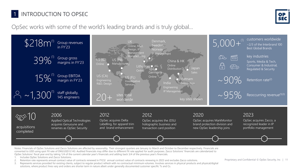 HIGHLIGHTS FOR FUTURE INVESTMENT OpSec represents a compelling investment opportunity… A leading global provider in IP/brand optimization, monetization, and protection with a complete end-to-end offering 1 Large, fast-growing addressable markets, benefitting from a number of macro trends driving increased spend in IP/brand 2 Innovation-driven, with solutions enhanced by proprietary technology and modern software platforms 3 Exceptional calibre of customer base, representing around two-thirds of the world’s best brands (Interbrand100 Best Global Brands) 4 Strong management team with decades of experience and successful execution of M&A and integration 5 Significant runway for growth through continued expansion into existing/adjacent markets and capabilities, including M&A 6 Compelling financials underpinned by highly reoccurring revenues and strong growth and profitability 7 Proprietary and Confidential © OpSec Security, Inc | 10