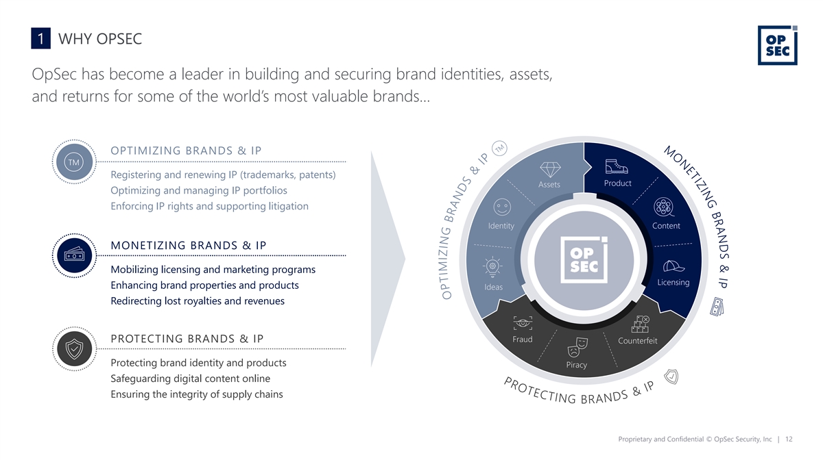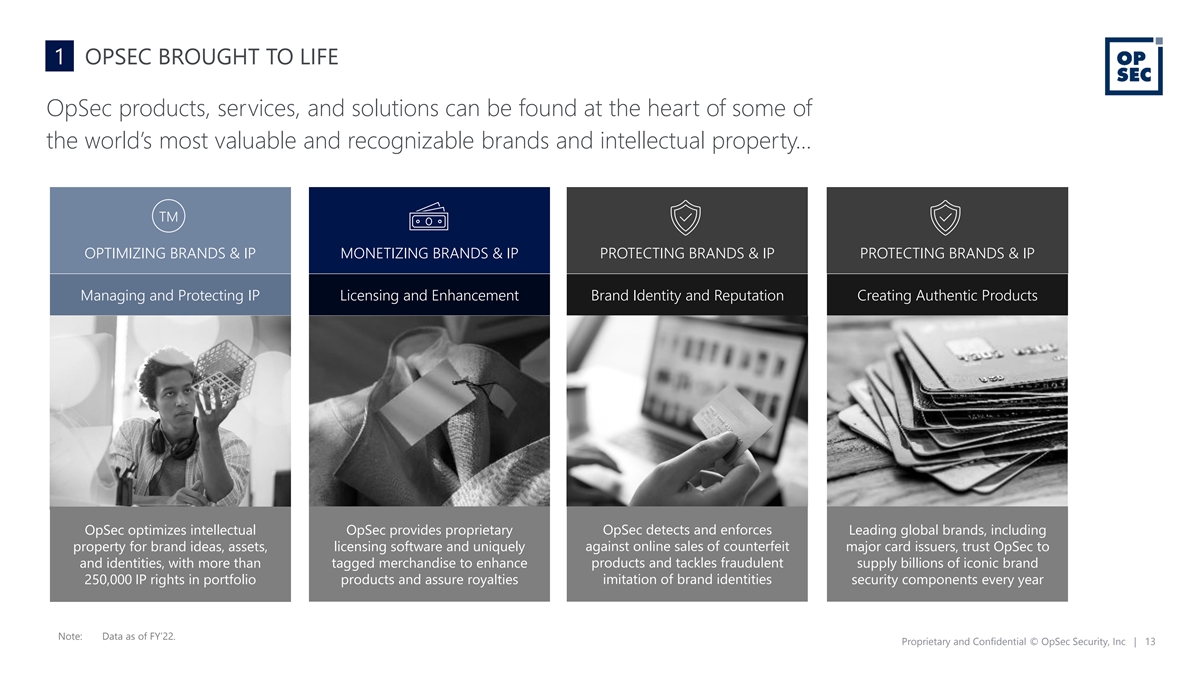 1 WHY OPSEC OpSec has become a leader in building and securing brand identities, assets, and returns for some of the world’s most valuable brands… OPTIMIZING BRANDS & IP Registering and renewing IP (trademarks, patents) Product Assets Optimizing and managing IP portfolios Enforcing IP rights and supporting litigation Identity Content MONETIZING BRANDS & IP Mobilizing licensing and marketing programs Licensing Enhancing brand properties and products Ideas Redirecting lost royalties and revenues Fraud PROTECTING BRANDS & IP Counterfeit Protecting brand identity and products Piracy Safeguarding digital content online Ensuring the integrity of supply chains Proprietary and Confidential © OpSec Security, Inc | 12