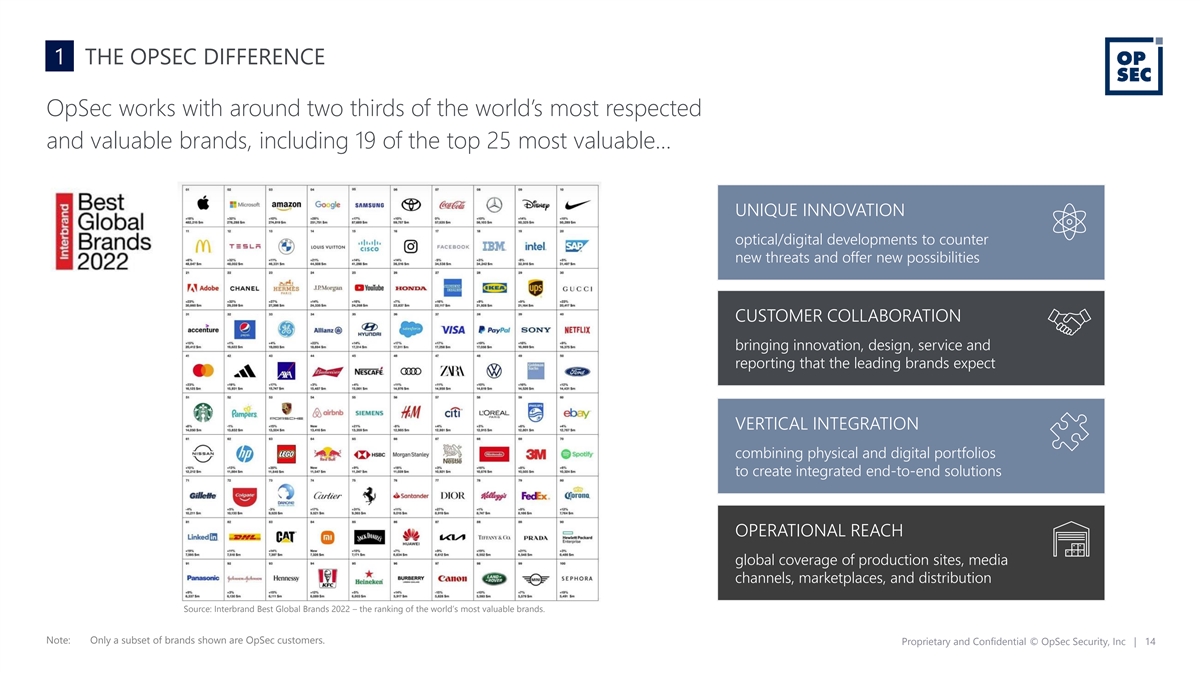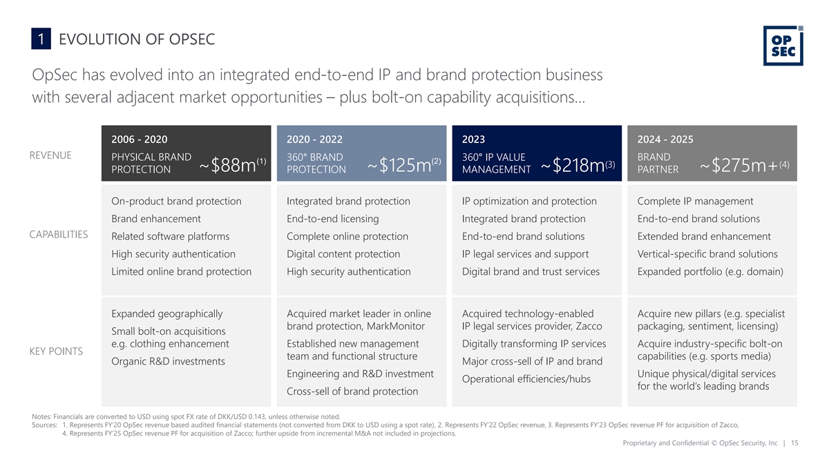 1 THE OPSEC DIFFERENCE OpSec works with around two thirds of the world’s most respected and valuable brands, including 19 of the top 25 most valuable… UNIQUE INNOVATION optical/digital developments to counter new threats and offer new possibilities CUSTOMER COLLABORATION bringing innovation, design, service and reporting that the leading brands expect VERTICAL INTEGRATION combining physical and digital portfolios to create integrated end-to-end solutions OPERATIONAL REACH global coverage of production sites, media channels, marketplaces, and distribution Source: Interbrand Best Global Brands 2022 – the ranking of the world’s most valuable brands. Note: Only a subset of brands shown are OpSec customers. Proprietary and Confidential © OpSec Security, Inc | 14