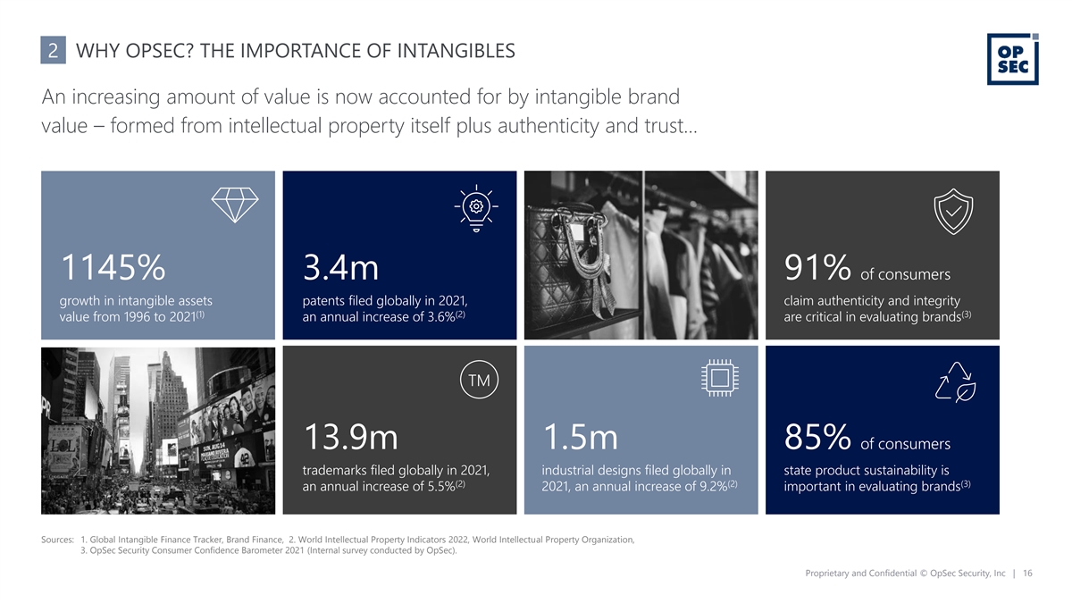 2 WHY OPSEC? THE IMPORTANCE OF INTANGIBLES An increasing amount of value is now accounted for by intangible brand value – formed from intellectual property itself plus authenticity and trust… 1145% 3.4m 91% of consumers growth in intangible assets patents filed globally in 2021, claim authenticity and integrity (1) (2) (3) value from 1996 to 2021 an annual increase of 3.6% are critical in evaluating brands 13.9m 1.5m 85% of consumers trademarks filed globally in 2021, industrial designs filed globally in state product sustainability is (2) (2) (3) an annual increase of 5.5% 2021, an annual increase of 9.2% important in evaluating brands Sources: 1. Global Intangible Finance Tracker, Brand Finance, 2. World Intellectual Property Indicators 2022, World Intellectual Property Organization, 3. OpSec Security Consumer Confidence Barometer 2021 (Internal survey conducted by OpSec). Proprietary and Confidential © OpSec Security, Inc | 16