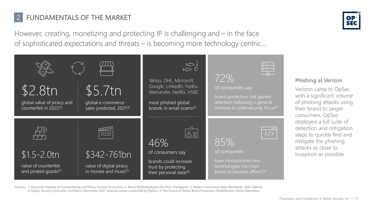 2 FUNDAMENTALS OF THE MARKET However, creating, monetizing and protecting IP is challenging and – in the face of sophisticated expectations and threats – is becoming more technology centric… $225-600bn cost of intellectual property theft Yahoo, DHL, Microsoft, 72% Phishing at Verizon Google, LinkedIn, FedEx, of companies say Verizon came to OpSec Wetransfer, Netflix, HSBC $2.8tn $5.7tn with a significant volume brand protection has gained attention following a general global value of piracy and global e-commerce most phished global of phishing attacks using (5) (1) (3) (2) counterfeit in 2022 increase in cybersecurity focus sales predicted, 2021 brands in email scams their brand to target consumers. OpSec deployed a full suite of annual increase 2020-21 detection and mitigation steps to quickly find and mitigate the phishing 85% 46% attacks as close to of companies of consumers say inception as possible. $1.5-2.0tn $342-761bn have incorporated new brands could increase value of counterfeit value of digital piracy technologies into their trust by protecting (1) (1) (5) (4) and pirated goods in movies and music brand protection efforts their personal data Sources: 1. Economic Impacts of Counterfeiting and Piracy, Frontier Economics, 2. Brand Phishing Report Q4 2022, Checkpoint, 3. Retail e-Commerce Sales Worldwide 2022, Statista, 4. OpSec Security Consumer Confidence Barometer 2021 (Internal survey conducted by OpSec), 5. The Future of Online Brand Protection, MarkMonitor Online Barometer. Proprietary and Confidential © OpSec Security, Inc | 17