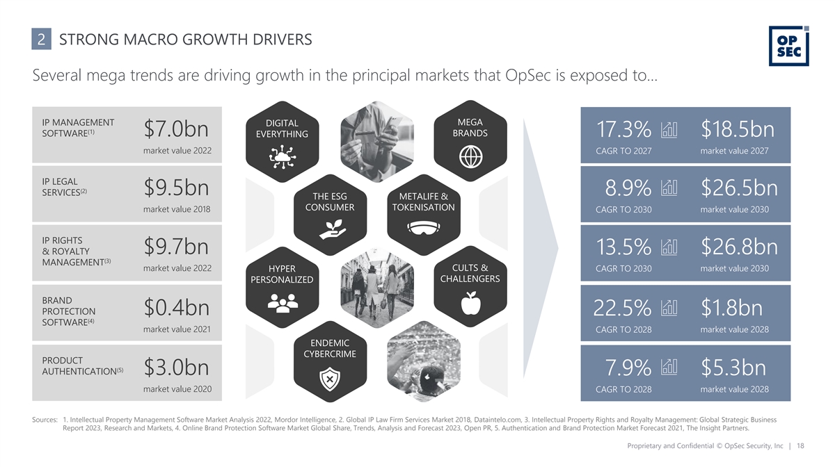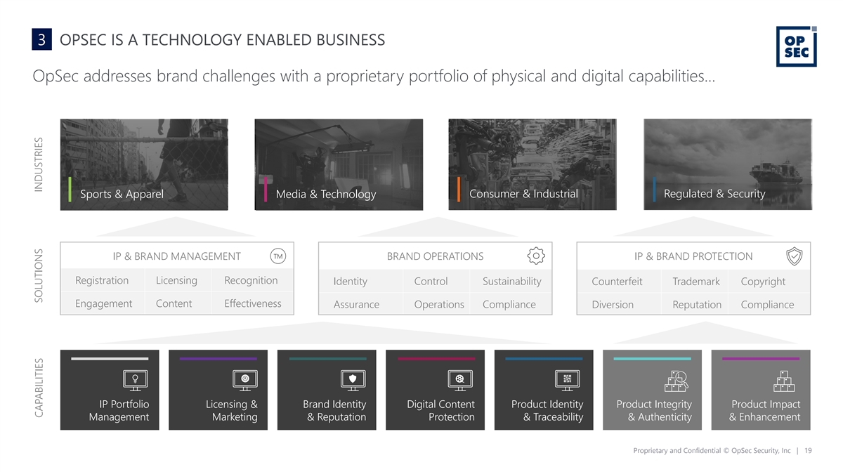 2 STRONG MACRO GROWTH DRIVERS Several mega trends are driving growth in the principal markets that OpSec is exposed to… MEGA IP MANAGEMENT DIGITAL (1) SOFTWARE $7.0bn BRANDS EVERYTHING 17.3% $18.5bn market value 2022 CAGR TO 2027 market value 2027 IP LEGAL (2) SERVICES $9.5bn 8.9% $26.5bn THE ESG METALIFE & CONSUMER TOKENISATION market value 2018 CAGR TO 2030 market value 2030 IP RIGHTS & ROYALTY $9.7bn 13.5% $26.8bn (3) MANAGEMENT market value 2022 CULTS & HYPER CAGR TO 2030 market value 2030 CHALLENGERS PERSONALIZED BRAND PROTECTION $0.4bn $1.8bn 22.5% (4) SOFTWARE market value 2021 CAGR TO 2028 market value 2028 ENDEMIC CYBERCRIME PRODUCT (5) AUTHENTICATION $3.0bn 7.9% $5.3bn market value 2020 CAGR TO 2028 market value 2028 Sources: 1. Intellectual Property Management Software Market Analysis 2022, Mordor Intelligence, 2. Global IP Law Firm Services Market 2018, Dataintelo.com, 3. Intellectual Property Rights and Royalty Management: Global Strategic Business Report 2023, Research and Markets, 4. Online Brand Protection Software Market Global Share, Trends, Analysis and Forecast 2023, Open PR, 5. Authentication and Brand Protection Market Forecast 2021, The Insight Partners. Proprietary and Confidential © OpSec Security, Inc | 18
