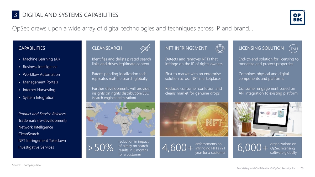 3 DIGITAL AND SYSTEMS CAPABILITIES OpSec draws upon a wide array of digital technologies and techniques across IP and brand… CAPABILITIES CLEANSEARCH NFT INFRINGEMENT LICENSING SOLUTION ▪ Machine Learning (AI) Identifies and delists pirated search Detects and removes NFTs that End-to-end solution for licensing to links and drives legitimate content infringe on the IP of rights owners monetize and protect properties ▪ Business Intelligence Patent-pending localization tech First to market with an enterprise Combines physical and digital ▪ Workflow Automation replicates real-life search globally solution across NFT marketplaces components and platforms ▪ Management Portals Further developments will provide Reduces consumer confusion and Consumer engagement based on ▪ Internet Harvesting insights on rights distribution/SEO cleans market for genuine drops API integration to existing platform ▪ System Integration (search engine optimization) Product and Service Releases Trademark (re-development) Network Intelligence CleanSearch NFT Infringement Takedown reduction in impact enforcements on organizations on of piracy on search Investigative Services infringing NFTs in 1 OpSec licensing >50% 4,600+ 6,000+ results in 2 months year for a customer software globally for a customer Source: Company data. Proprietary and Confidential © OpSec Security, Inc | 20