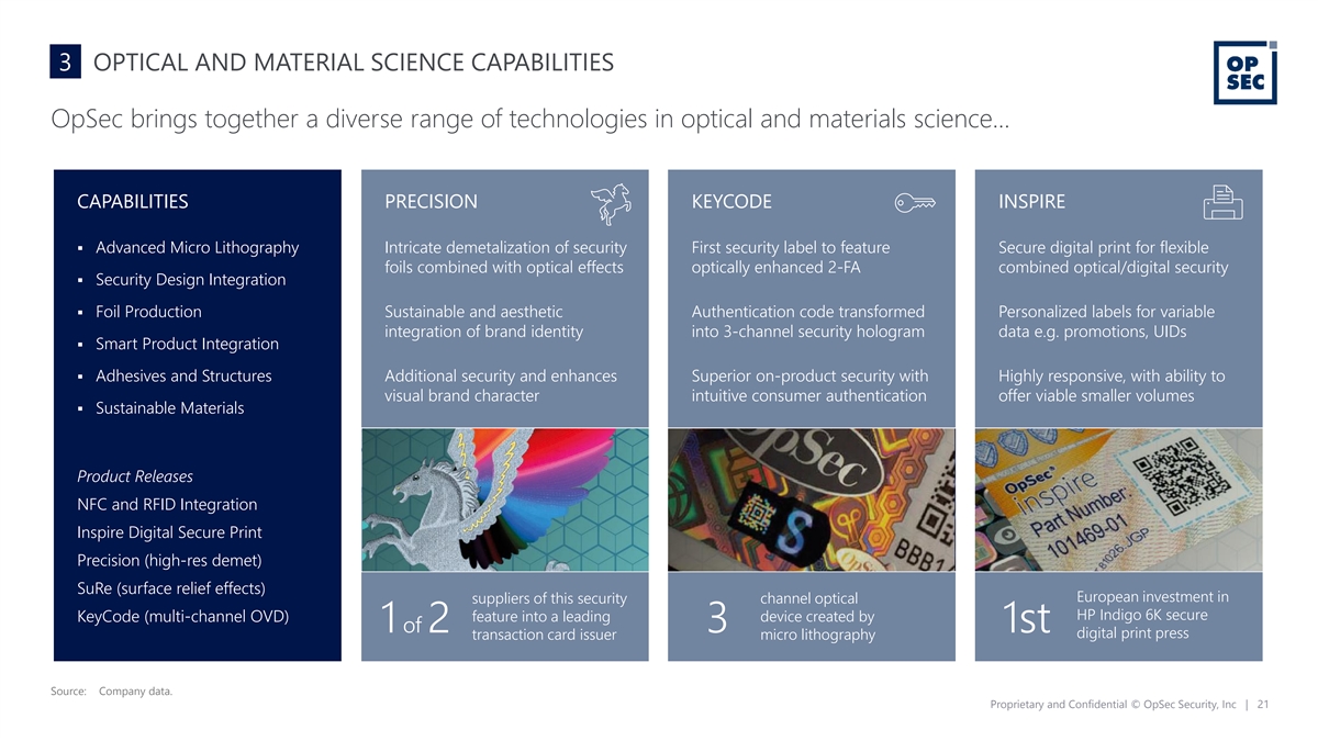 3 OPTICAL AND MATERIAL SCIENCE CAPABILITIES OpSec brings together a diverse range of technologies in optical and materials science… CAPABILITIES PRECISION KEYCODE INSPIRE ▪ Advanced Micro Lithography Intricate demetalization of security First security label to feature Secure digital print for flexible foils combined with optical effects optically enhanced 2-FA combined optical/digital security ▪ Security Design Integration ▪ Foil Production Sustainable and aesthetic Authentication code transformed Personalized labels for variable integration of brand identity into 3-channel security hologram data e.g. promotions, UIDs ▪ Smart Product Integration ▪ Adhesives and Structures Additional security and enhances Superior on-product security with Highly responsive, with ability to visual brand character intuitive consumer authentication offer viable smaller volumes ▪ Sustainable Materials Product Releases NFC and RFID Integration Inspire Digital Secure Print Precision (high-res demet) SuRe (surface relief effects) European investment in suppliers of this security channel optical HP Indigo 6K secure KeyCode (multi-channel OVD) feature into a leading device created by 1 of 2 3 1st digital print press transaction card issuer micro lithography Source: Company data. Proprietary and Confidential © OpSec Security, Inc | 21