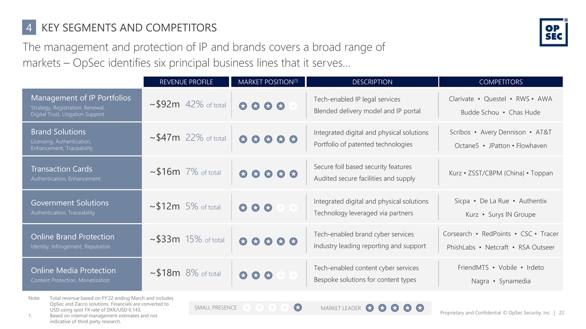 4 KEY SEGMENTS AND COMPETITORS The management and protection of IP and brands covers a broad range of markets – OpSec identifies six principal business lines that it serves… (1) REVENUE PROFILE MARKET POSITION DESCRIPTION COMPETITORS Management of IP Portfolios Clarivate • Questel • RWS • AWA Tech-enabled IP legal services ~$92m 42% of total Strategy, Registration, Renewal, Blended delivery model and IP portal Budde Schou • Chas Hude Digital Trust, Litigation Support Brand Solutions Integrated digital and physical solutions Scribos • Avery Dennison • AT&T ~$47m 22% of total Licensing, Authentication, Portfolio of patented technologies Octane5 • JPatton • Flowhaven Enhancement, Traceability Secure foil based security features Transaction Cards ~$16m 7% of total Kurz • ZSST/CBPM (China) • Toppan Authentication, Enhancement Audited secure facilities and supply Integrated digital and physical solutions Sicpa • De La Rue • Authentix Government Solutions ~$12m 5% of total Authentication, Traceability Technology leveraged via partners Kurz • Surys IN Groupe Tech-enabled brand cyber services Corsearch • RedPoints • CSC • Tracer Online Brand Protection ~$33m 15% of total Industry leading reporting and support Identity, Infringement, Reputation PhishLabs • Netcraft • RSA Outseer FriendMTS • Vobile • Irdeto Tech-enabled content cyber services Online Media Protection ~$18m 8% of total Content Protection, Monetization Bespoke solutions for content types Nagra • Synamedia Note: Total revenue based on FY’22 ending March and includes OpSec and Zacco solutions. Financials are converted to SMALL PRESENCE MARKET LEADER USD using spot FX rate of DKK/USD 0.143. Proprietary and Confidential © OpSec Security, Inc | 22 1. Based on internal management estimates and not indicative of third party research.