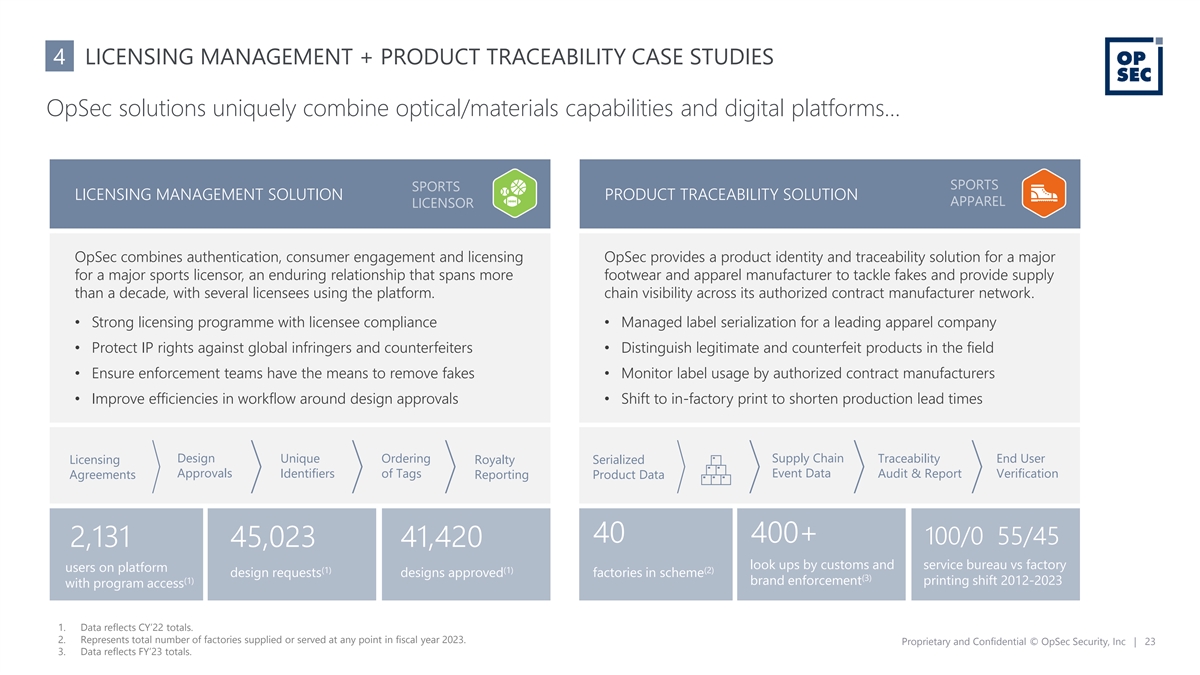 4 LICENSING MANAGEMENT + PRODUCT TRACEABILITY CASE STUDIES OpSec solutions uniquely combine optical/materials capabilities and digital platforms… SPORTS SPORTS LICENSING MANAGEMENT SOLUTION PRODUCT TRACEABILITY SOLUTION APPAREL LICENSOR OpSec combines authentication, consumer engagement and licensing OpSec provides a product identity and traceability solution for a major for a major sports licensor, an enduring relationship that spans more footwear and apparel manufacturer to tackle fakes and provide supply than a decade, with several licensees using the platform. chain visibility across its authorized contract manufacturer network. • Strong licensing programme with licensee compliance • Managed label serialization for a leading apparel company • Protect IP rights against global infringers and counterfeiters • Distinguish legitimate and counterfeit products in the field • Ensure enforcement teams have the means to remove fakes • Monitor label usage by authorized contract manufacturers • Improve efficiencies in workflow around design approvals • Shift to in-factory print to shorten production lead times Design Unique Ordering Supply Chain Traceability End User Licensing Royalty Serialized Approvals Identifiers of Tags Event Data Audit & Report Verification Agreements Reporting Product Data 40 400+ 100/0 55/45 2,131 45,023 41,420 look ups by customs and service bureau vs factory users on platform (1) (1) (2) design requests designs approved factories in scheme (3) (1) brand enforcement printing shift 2012-2023 with program access 1. Data reflects CY’22 totals. 2. Represents total number of factories supplied or served at any point in fiscal year 2023. Proprietary and Confidential © OpSec Security, Inc | 23 3. Data reflects FY’23 totals.
