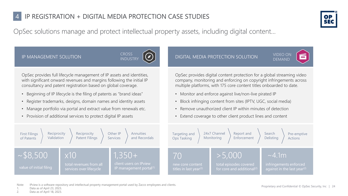 4 IP REGISTRATION + DIGITAL MEDIA PROTECTION CASE STUDIES OpSec solutions manage and protect intellectual property assets, including digital content… CROSS VIDEO ON IP MANAGEMENT SOLUTION DIGITAL MEDIA PROTECTION SOLUTION INDUSTRY DEMAND OpSec provides full lifecycle management of IP assets and identities, OpSec provides digital content protection for a global streaming video with significant onward revenues and margins following the initial IP company, monitoring and enforcing on copyright infringements across consultancy and patent registration based on global coverage. multiple platforms, with 175 core content titles onboarded to date. • Beginning of IP lifecycle is the filing of patents as “brand ideas” • Monitor and enforce against live/non-live pirated IP • Register trademarks, designs, domain names and identity assets • Block infringing content from sites (IPTV, UGC, social media) • Manage portfolio via portal and extract value from renewals etc. • Remove unauthorized client IP within minutes of detection • Provision of additional services to protect digital IP assets • Extend coverage to other client product lines and content Reciprocity Reciprocity Annuities 24x7 Channel Report and Search First Filings Other IP Targeting and Pre-emptive Validation Patent Filings and Recordals Monitoring Enforcement Delisting of Patents Services Ops Tasking Actions ~4.1m ~$8,500 x10 1,350+ >5,000 70 client users on IPview total revenues from all new core content total episodes covered infringements enforced (1) value of initial filing (2) (2) (2) IP management portal services over lifecycle titles in last year for core and additional against in the last year Note: IPview is a software repository and intellectual property management portal used by Zacco employees and clients. Proprietary and Confidential © OpSec Security, Inc | 24 1. Data as of April 23, 2023. 2. Data as of April 18, 2023.