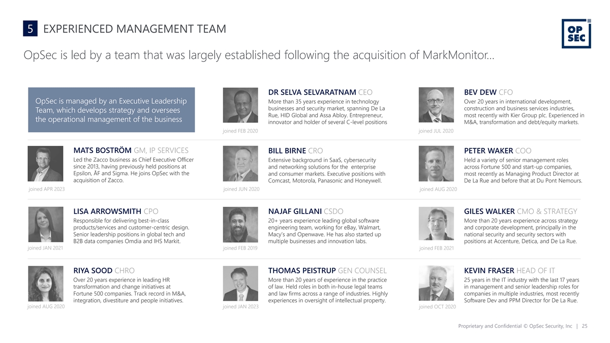 5 EXPERIENCED MANAGEMENT TEAM OpSec is led by a team that was largely established following the acquisition of MarkMonitor… DR SELVA SELVARATNAM CEO BEV DEW CFO OpSec is managed by an Executive Leadership More than 35 years experience in technology Over 20 years in international development, businesses and security market, spanning De La construction and business services industries, Team, which develops strategy and oversees Rue, HID Global and Assa Abloy. Entrepreneur, most recently with Kier Group plc. Experienced in the operational management of the business innovator and holder of several C-level positions M&A, transformation and debt/equity markets. joined FEB 2020 joined JUL 2020 MATS BOSTRÖM GM, IP SERVICES BILL BIRNE CRO PETER WAKER COO Led the Zacco business as Chief Executive Officer Extensive background in SaaS, cybersecurity Held a variety of senior management roles since 2013, having previously held positions at and networking solutions for the enterprise across Fortune 500 and start-up companies, Epsilon, ÅF and Sigma. He joins OpSec with the and consumer markets. Executive positions with most recently as Managing Product Director at acquisition of Zacco. Comcast, Motorola, Panasonic and Honeywell. De La Rue and before that at Du Pont Nemours. joined APR 2023 joined JUN 2020 joined AUG 2020 LISA ARROWSMITH CPO NAJAF GILLANI CSDO GILES WALKER CMO & STRATEGY Responsible for delivering best-in-class 20+ years experience leading global software More than 20 years experience across strategy products/services and customer-centric design. engineering team, working for eBay, Walmart, and corporate development, principally in the Senior leadership positions in global tech and Macy’s and Openwave. He has also started up national security and security sectors with B2B data companies Omdia and IHS Markit. multiple businesses and innovation labs. positions at Accenture, Detica, and De La Rue. joined JAN 2021 joined FEB 2019 joined FEB 2021 RIYA SOOD CHRO THOMAS PEISTRUP GEN COUNSEL KEVIN FRASER HEAD OF IT Over 20 years experience in leading HR More than 20 years of experience in the practice 25 years in the IT industry with the last 17 years transformation and change initiatives at of law. Held roles in both in-house legal teams in management and senior leadership roles for Fortune 500 companies. Track record in M&A, and law firms across a range of industries. Highly companies in multiple industries, most recently integration, divestiture and people initiatives. experiences in oversight of intellectual property. Software Dev and PPM Director for De La Rue. joined AUG 2020 joined JAN 2023 joined OCT 2020 Proprietary and Confidential © OpSec Security, Inc | 25