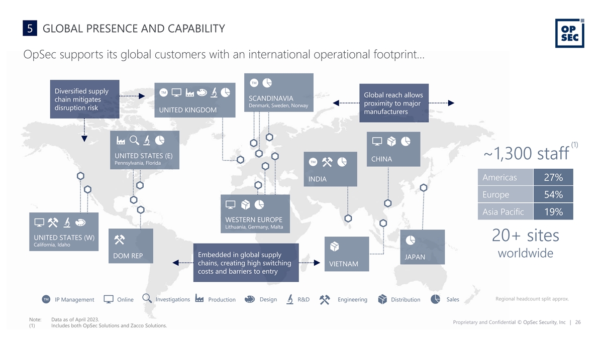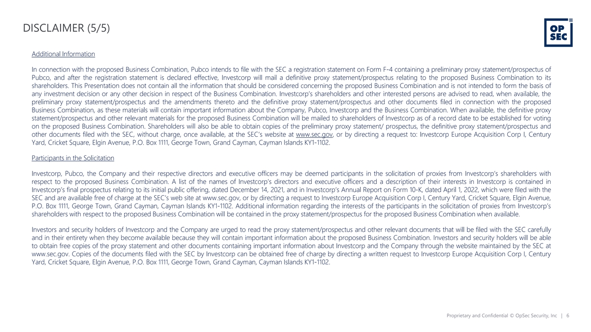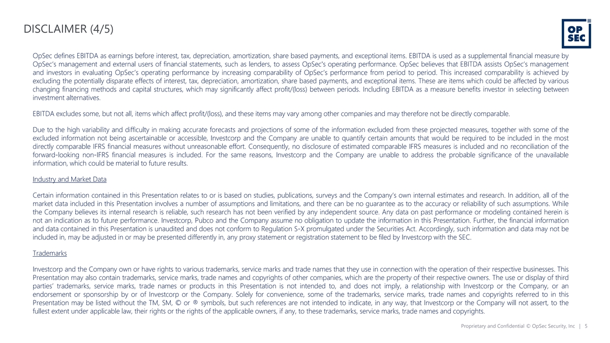 DISCLAIMER (3/5) The distribution of this Presentation may also be restricted by law and persons into whose possession this Presentation comes should inform themselves about and observe any such restrictions. The recipient acknowledges that it is (a) aware that the United States securities laws prohibit any person who has material, non-public information concerning a company from purchasing or selling securities of such company or from communicating such information to any other person under circumstances in which it is reasonably foreseeable that such person is likely to purchase or sell such securities, and (b) familiar with the Securities Exchange Act of 1934, as amended, and the rules and regulations promulgated thereunder (collectively, the “Exchange Act”), and that the recipient will neither use, nor cause any third party to use, this Presentation or any information contained herein in contravention of the Exchange Act, including, without limitation, Rule 10b-5 thereunder. NEITHER THE SECURITIES AND EXCHANGE COMMISSION NOR ANY STATE OR TERRITORIAL SECURITIES COMMISSION HAS APPROVED OR DISAPPROVED OF THE SECURITIES OR DETERMINED IF THIS PRESENTATION IS TRUTHFUL OR COMPLETE. Projections This Presentation contains certain financial forecast information of the Company, including, but not limited to, estimated results for fiscal year 2023 and the Company’s long-term business model. Such financial forecast information constitutes forward-looking information, and is for illustrative purposes only and should not be relied upon as necessarily being indicative of future results. The assumptions and estimates underlying such financial forecast information are inherently uncertain and are subject to a wide variety of significant business, economic, competitive and other risks and uncertainties. See “Forward-Looking Statements” above. Actual results may differ materially from the results contemplated by the financial forecast information contained in this Presentation, and the inclusion of such information in this Presentation should not be regarded as a representation by any person that the results reflected in such forecasts will be achieved. None of Investcorp’s, Pubco’s or the Company’s independent auditors have audited, reviewed, compiled or performed any procedures with respect to the projections for the purpose of their inclusion in this Presentation; and, accordingly, neither of them expressed an opinion or provided any other form of assurance with respect thereto for the purpose of this Presentation. In addition, the analyses of the Company, Pubco and Investcorp contained herein are not, and do not purport to be, appraisals of the securities, assets or business of the Company, Pubco, Investcorp or any entity. Non-IFRS Financial Measures This Presentation contains non-IFRS financial measures. Any non-IFRS financial measures contained in this Presentation are not measures of financial performance calculated in accordance with IFRS and should not be considered replacements or alternatives to net income or loss, cash flow from operations or other IFRS measures of operating performance or liquidity. Non-IFRS financial measures should be viewed in addition to, and not as a substitute for, analysis of the Company's results reported in accordance with IFRS. Notwithstanding these limitations, and in conjunction with other accounting and financial information available, the Company's management considers such non-IFRS financial measures reasonable indicators for comparisons of the Company against the Company's principal competitors. Please refer to the Appendix of this Presentation for a reconciliation of EBITDA to operating profit. Proprietary and Confidential © OpSec Security, Inc | 4