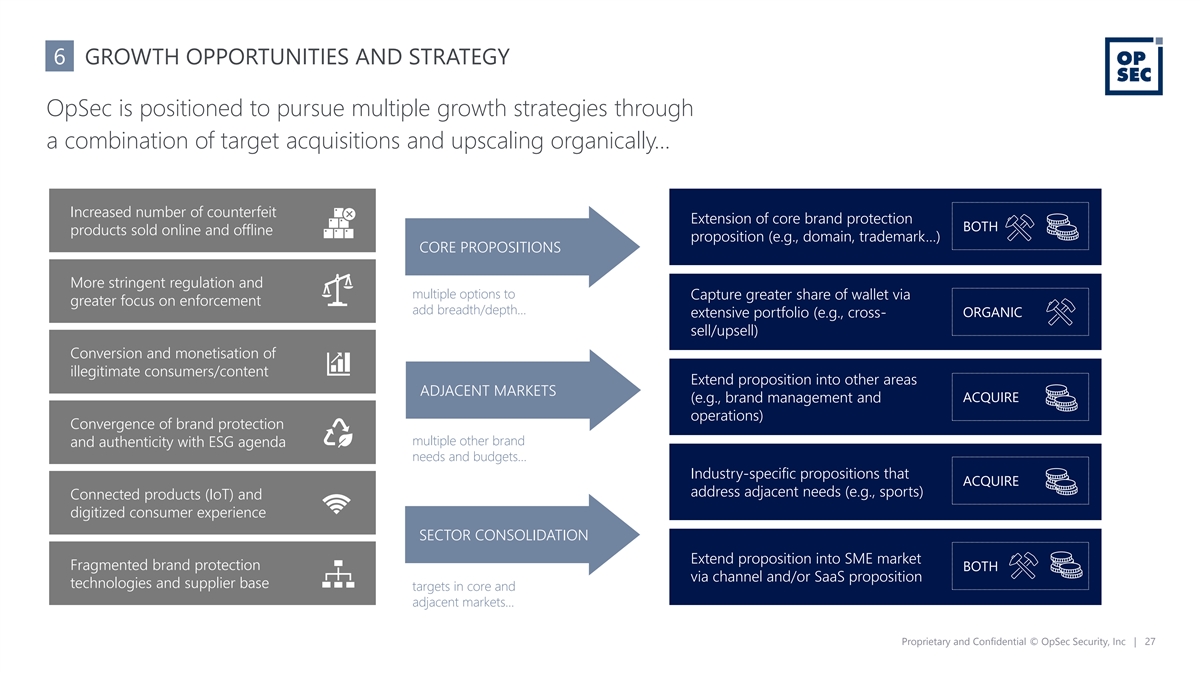 6 GROWTH OPPORTUNITIES AND STRATEGY OpSec is positioned to pursue multiple growth strategies through a combination of target acquisitions and upscaling organically… Increased number of counterfeit Extension of core brand protection BOTH products sold online and offline proposition (e.g., domain, trademark…) CORE PROPOSITIONS More stringent regulation and multiple options to Capture greater share of wallet via greater focus on enforcement add breadth/depth… extensive portfolio (e.g., cross- ORGANIC sell/upsell) Conversion and monetisation of illegitimate consumers/content Extend proposition into other areas ADJACENT MARKETS (e.g., brand management and ACQUIRE operations) Convergence of brand protection multiple other brand and authenticity with ESG agenda needs and budgets… Industry-specific propositions that ACQUIRE address adjacent needs (e.g., sports) Connected products (IoT) and digitized consumer experience SECTOR CONSOLIDATION Extend proposition into SME market Fragmented brand protection BOTH via channel and/or SaaS proposition technologies and supplier base targets in core and adjacent markets… Proprietary and Confidential © OpSec Security, Inc | 27