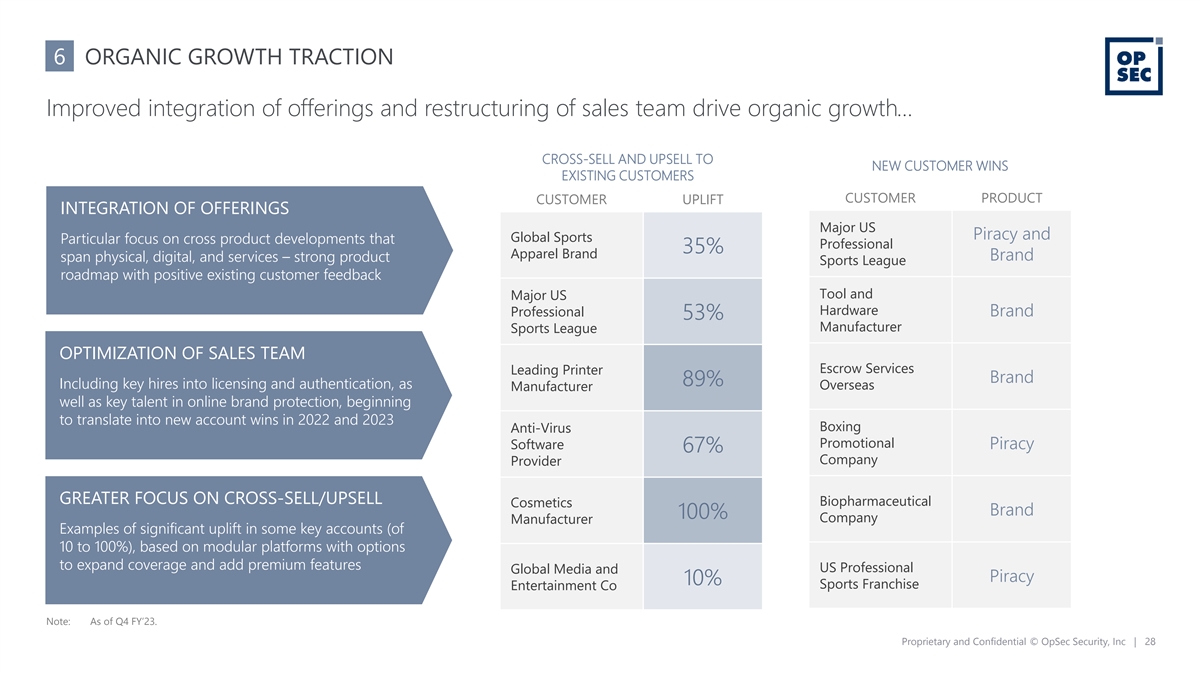 6 ORGANIC GROWTH TRACTION Improved integration of offerings and restructuring of sales team drive organic growth… CROSS-SELL AND UPSELL TO NEW CUSTOMER WINS EXISTING CUSTOMERS CUSTOMER PRODUCT CUSTOMER UPLIFT INTEGRATION OF OFFERINGS Major US Piracy and Global Sports Particular focus on cross product developments that Professional 35% Apparel Brand Brand span physical, digital, and services – strong product Sports League roadmap with positive existing customer feedback Tool and Major US Hardware Professional Brand 53% Manufacturer Sports League OPTIMIZATION OF SALES TEAM Escrow Services Leading Printer Brand 89% Including key hires into licensing and authentication, as Overseas Manufacturer well as key talent in online brand protection, beginning to translate into new account wins in 2022 and 2023 Boxing Anti-Virus Promotional Software Piracy 67% Company Provider GREATER FOCUS ON CROSS-SELL/UPSELL Biopharmaceutical Cosmetics Brand 100% Company Manufacturer Examples of significant uplift in some key accounts (of 10 to 100%), based on modular platforms with options to expand coverage and add premium features US Professional Global Media and Piracy 10% Sports Franchise Entertainment Co Note: As of Q4 FY’23. Proprietary and Confidential © OpSec Security, Inc | 28