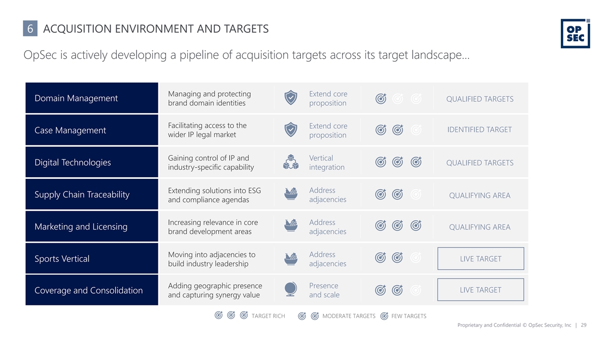 6 ACQUISITION ENVIRONMENT AND TARGETS OpSec is actively developing a pipeline of acquisition targets across its target landscape… Managing and protecting Extend core Domain Management QUALIFIED TARGETS brand domain identities proposition Facilitating access to the Extend core IDENTIFIED TARGET Case Management wider IP legal market proposition Gaining control of IP and Vertical Digital Technologies QUALIFIED TARGETS industry-specific capability integration Extending solutions into ESG Address Supply Chain Traceability QUALIFYING AREA adjacencies and compliance agendas Increasing relevance in core Address Marketing and Licensing QUALIFYING AREA brand development areas adjacencies Moving into adjacencies to Address Sports Vertical LIVE TARGET adjacencies build industry leadership Adding geographic presence Presence LIVE TARGET Coverage and Consolidation and capturing synergy value and scale TARGET RICH MODERATE TARGETS FEW TARGETS Proprietary and Confidential © OpSec Security, Inc | 29