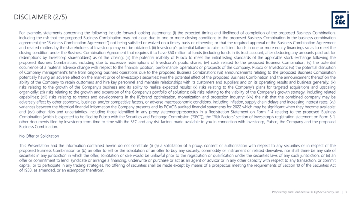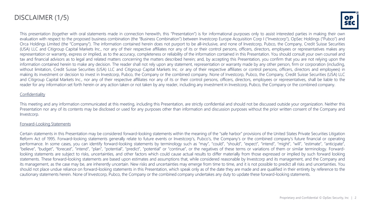 DISCLAIMER (1/5) This presentation (together with oral statements made in connection herewith, this “Presentation”) is for informational purposes only to assist interested parties in making their own evaluation with respect to the proposed business combination (the “Business Combination”) between Investcorp Europe Acquisition Corp I (“Investcorp”), OpSec Holdings (“Pubco”) and Orca Holdings Limited (the “Company”). The information contained herein does not purport to be all-inclusive, and none of Investcorp, Pubco, the Company, Credit Suisse Securities (USA) LLC and Citigroup Capital Markets Inc., nor any of their respective affiliates nor any of its or their control persons, officers, directors, employees or representatives makes any representation or warranty, express or implied, as to the accuracy, completeness or reliability of the information contained in this Presentation. You should consult your own counsel and tax and financial advisors as to legal and related matters concerning the matters described herein; and, by accepting this Presentation, you confirm that you are not relying upon the information contained herein to make any decision. The reader shall not rely upon any statement, representation or warranty made by any other person, firm or corporation (including, without limitation, Credit Suisse Securities (USA) LLC and Citigroup Capital Markets Inc. or any of their respective affiliates or control persons, officers, directors and employees) in making its investment or decision to invest in Investcorp, Pubco, the Company or the combined company. None of Investcorp, Pubco, the Company, Credit Suisse Securities (USA) LLC and Citigroup Capital Markets Inc., nor any of their respective affiliates nor any of its or their control persons, officers, directors, employees or representatives, shall be liable to the reader for any information set forth herein or any action taken or not taken by any reader, including any investment in Investcorp, Pubco, the Company or the combined company. Confidentiality This meeting and any information communicated at this meeting, including this Presentation, are strictly confidential and should not be discussed outside your organization. Neither this Presentation nor any of its contents may be disclosed or used for any purposes other than information and discussion purposes without the prior written consent of the Company and Investcorp. Forward-Looking Statements Certain statements in this Presentation may be considered forward-looking statements within the meaning of the “safe harbor” provisions of the United States Private Securities Litigation Reform Act of 1995. Forward-looking statements generally relate to future events or Investcorp’s, Pubco’s, the Company’s or the combined company’s future financial or operating performance. In some cases, you can identify forward-looking statements by terminology such as “may”, “could”, “should”, “expect”, “intend”, “might”, “will”, “estimate”, “anticipate”, “believe”, “budget”, “forecast”, “intend”, “plan”, “potential”, “predict”, “potential” or “continue”, or the negatives of these terms or variations of them or similar terminology. Forward- looking statements are subject to risks, uncertainties, and other factors which could cause actual results to differ materially from those expressed or implied by such forward looking statements. These forward-looking statements are based upon estimates and assumptions that, while considered reasonable by Investcorp and its management, and the Company and its management, as the case may be, are inherently uncertain. New risks and uncertainties may emerge from time to time, and it is not possible to predict all risks and uncertainties. You should not place undue reliance on forward-looking statements in this Presentation, which speak only as of the date they are made and are qualified in their entirety by reference to the cautionary statements herein. None of Investcorp, Pubco, the Company or the combined company undertakes any duty to update these forward-looking statements. Proprietary and Confidential © OpSec Security, Inc | 2