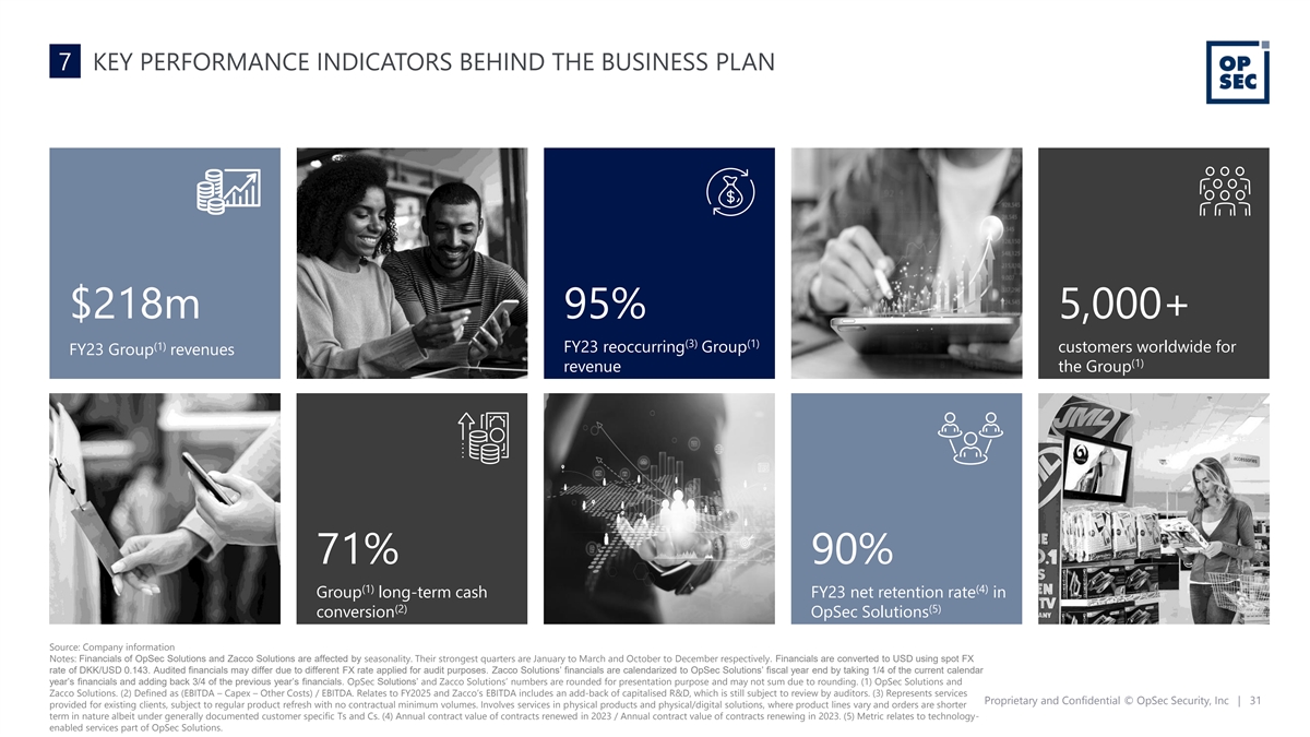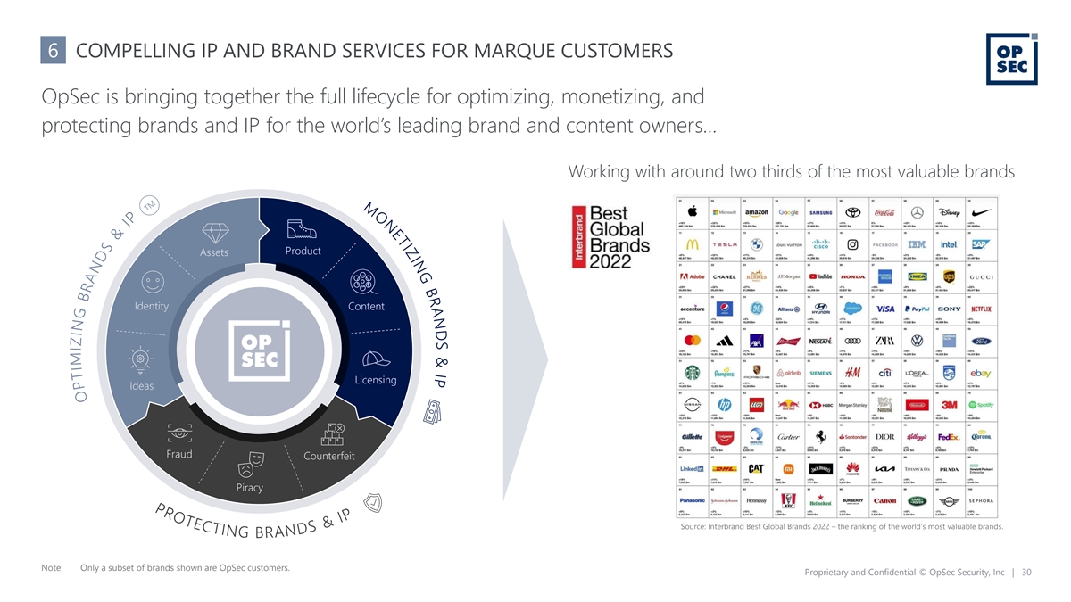 6 COMPELLING IP AND BRAND SERVICES FOR MARQUE CUSTOMERS OpSec is bringing together the full lifecycle for optimizing, monetizing, and protecting brands and IP for the world’s leading brand and content owners… Working with around two thirds of the most valuable brands Product Assets Identity Content Licensing Ideas Fraud Counterfeit Piracy Source: Interbrand Best Global Brands 2022 – the ranking of the world’s most valuable brands. Note: Only a subset of brands shown are OpSec customers. Proprietary and Confidential © OpSec Security, Inc | 30