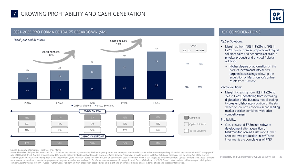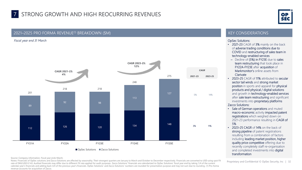 7 KEY PERFORMANCE INDICATORS BEHIND THE BUSINESS PLAN $218m 95% 5,000+ (3) (1) (1) FY23 reoccurring Group customers worldwide for FY23 Group revenues (1) revenue the Group 71% 90% (1) (4) Group long-term cash FY23 net retention rate in (2) (5) conversion OpSec Solutions Source: Company information Notes: Financials of OpSec Solutions and Zacco Solutions are affected by seasonality. Their strongest quarters are January to March and October to December respectively. Financials are converted to USD using spot FX rate of DKK/USD 0.143. Audited financials may differ due to different FX rate applied for audit purposes. Zacco Solutions’ financials are calendarized to OpSec Solutions’ fiscal year end by taking 1/4 of the current calendar year’s financials and adding back 3/4 of the previous year’s financials. OpSec Solutions’ and Zacco Solutions’ numbers are rounded for presentation purpose and may not sum due to rounding. (1) OpSec Solutions and Zacco Solutions. (2) Defined as (EBITDA – Capex – Other Costs) / EBITDA. Relates to FY2025 and Zacco’s EBITDA includes an add-back of capitalised R&D, which is still subject to review by auditors. (3) Represents services Proprietary and Confidential © OpSec Security, Inc | 31 provided for existing clients, subject to regular product refresh with no contractual minimum volumes. Involves services in physical products and physical/digital solutions, where product lines vary and orders are shorter term in nature albeit under generally documented customer specific Ts and Cs. (4) Annual contract value of contracts renewed in 2023 / Annual contract value of contracts renewing in 2023. (5) Metric relates to technology- enabled services part of OpSec Solutions.