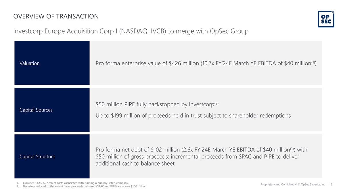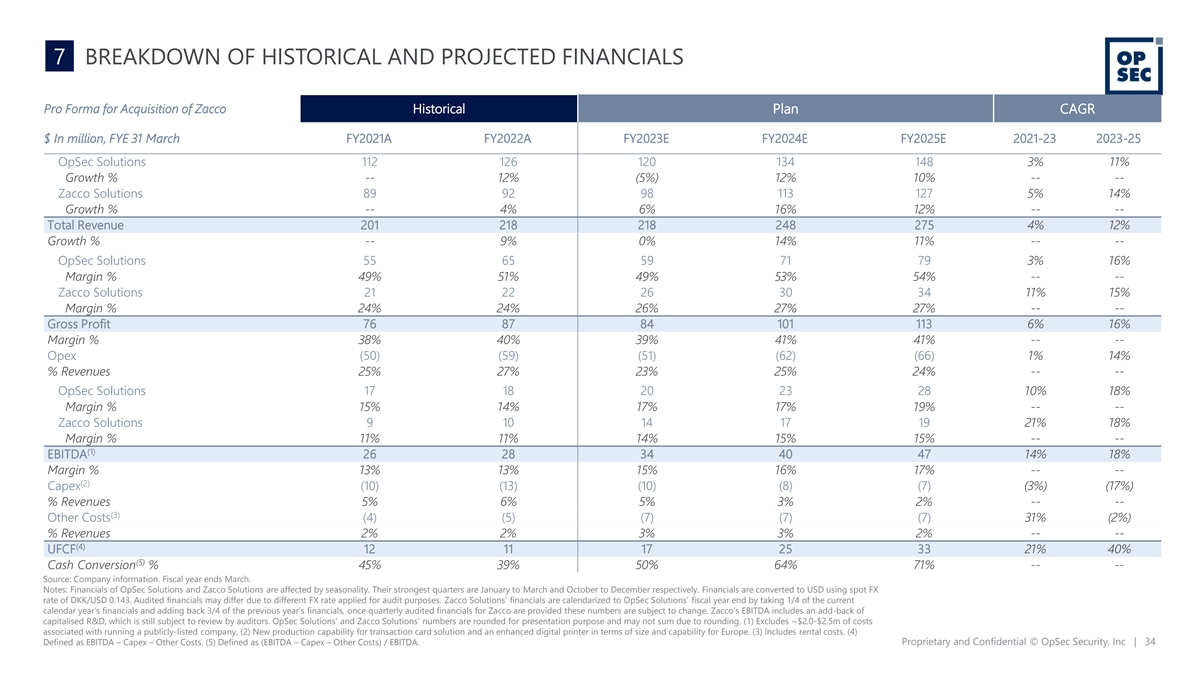 7 BREAKDOWN OF HISTORICAL AND PROJECTED FINANCIALS Pro Forma for Acquisition of Zacco Historical Plan CAGR $ In million, FYE 31 March FY2021A FY2022A FY2023E FY2024E FY2025E 2021-23 2023-25 OpSec Solutions 112 126 120 134 148 3% 11% Growth % -- 12% (5%) 12% 10% -- -- Zacco Solutions 89 92 98 113 127 5% 14% Growth % -- 4% 6% 16% 12% -- -- Total Revenue 201 218 218 248 275 4% 12% Growth % -- 9% 0% 14% 11% -- -- OpSec Solutions 55 65 59 71 79 3% 16% Margin % 49% 51% 49% 53% 54% -- -- Zacco Solutions 21 22 26 30 34 11% 15% Margin % 24% 24% 26% 27% 27% -- -- Gross Profit 76 87 84 101 113 6% 16% Margin % 38% 40% 39% 41% 41% -- -- Opex (50) (59) (51) (62) (66) 1% 14% % Revenues 25% 27% 23% 25% 24% -- -- OpSec Solutions 17 18 20 23 28 10% 18% Margin % 15% 14% 17% 17% 19% -- -- Zacco Solutions 9 10 14 17 19 21% 18% Margin % 11% 11% 14% 15% 15% -- -- (1) EBITDA 26 28 34 40 47 14% 18% Margin % 13% 13% 15% 16% 17% -- -- (2) Capex (10) (13) (10) (8) (7) (3%) (17%) % Revenues 5% 6% 5% 3% 2% -- -- (3) Other Costs (4) (5) (7) (7) (7) 31% (2%) % Revenues 2% 2% 3% 3% 2% -- -- (4) UFCF 12 11 17 25 33 21% 40% (5) Cash Conversion % 45% 39% 50% 64% 71% -- -- Source: Company information. Fiscal year ends March. Notes: Financials of OpSec Solutions and Zacco Solutions are affected by seasonality. Their strongest quarters are January to March and October to December respectively. Financials are converted to USD using spot FX rate of DKK/USD 0.143. Audited financials may differ due to different FX rate applied for audit purposes. Zacco Solutions’ financials are calendarized to OpSec Solutions’ fiscal year end by taking 1/4 of the current calendar year’s financials and adding back 3/4 of the previous year’s financials, once quarterly audited financials for Zacco are provided these numbers are subject to change. Zacco’s EBITDA includes an add-back of capitalised R&D, which is still subject to review by auditors. OpSec Solutions’ and Zacco Solutions’ numbers are rounded for presentation purpose and may not sum due to rounding. (1) Excludes ~$2.0-$2.5m of costs associated with running a publicly-listed company. (2) New production capability for transaction card solution and an enhanced digital printer in terms of size and capability for Europe. (3) Includes rental costs. (4) Defined as EBITDA – Capex – Other Costs. (5) Defined as (EBITDA – Capex – Other Costs) / EBITDA. Proprietary and Confidential © OpSec Security, Inc | 34
