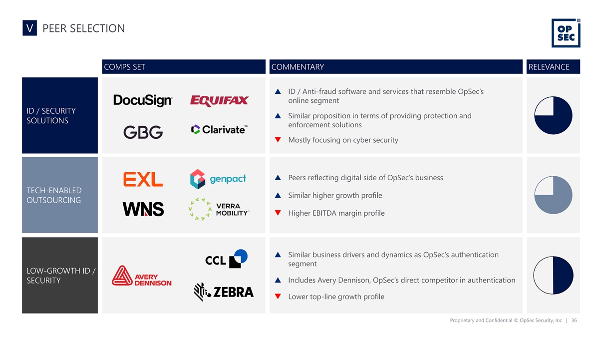 V PEER SELECTION COMPS SET COMMENTARY RELEVANCE p ID / Anti-fraud software and services that resemble OpSec’s online segment ID / SECURITY p Similar proposition in terms of providing protection and SOLUTIONS enforcement solutions q Mostly focusing on cyber security p Peers reflecting digital side of OpSec’s business TECH-ENABLED p Similar higher growth profile OUTSOURCING q Higher EBITDA margin profile p Similar business drivers and dynamics as OpSec’s authentication segment LOW-GROWTH ID / p Includes Avery Dennison, OpSec’s direct competitor in authentication SECURITY q Lower top-line growth profile Proprietary and Confidential © OpSec Security, Inc | 36