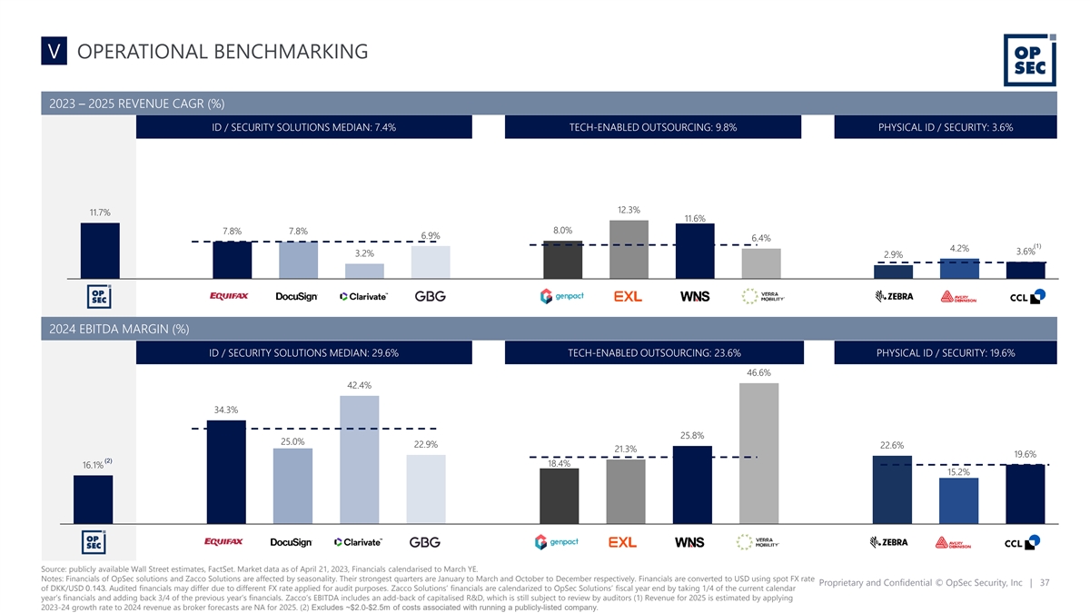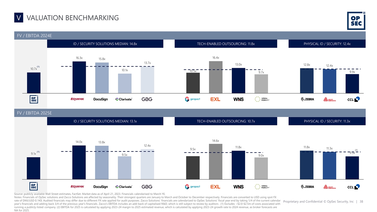 V OPERATIONAL BENCHMARKING 2023 – 2025 REVENUE CAGR (%) ID / SECURITY SOLUTIONS MEDIAN: 7.4% TECH-ENABLED OUTSOURCING: 9.8% PHYSICAL ID / SECURITY: 3.6% 12.3% 11.7% 11.6% 8.0% 7.8% 7.8% 6.9% 6.4% (1) 4.2% 3.6% 3.2% 2.9% 2024 EBITDA MARGIN (%) ID / SECURITY SOLUTIONS MEDIAN: 29.6% TECH-ENABLED OUTSOURCING: 23.6% PHYSICAL ID / SECURITY: 19.6% 46.6% 42.4% 34.3% 25.8% 25.0% 22.9% 22.6% 21.3% 19.6% (2) 18.4% 16.1% 15.2% Source: publicly available Wall Street estimates, FactSet. Market data as of April 21, 2023, Financials calendarised to March YE. Notes: Financials of OpSec solutions and Zacco Solutions are affected by seasonality. Their strongest quarters are January to March and October to December respectively. Financials are converted to USD using spot FX rate Proprietary and Confidential © OpSec Security, Inc | 37 of DKK/USD 0.143. Audited financials may differ due to different FX rate applied for audit purposes. Zacco Solutions’ financials are calendarized to OpSec Solutions’ fiscal year end by taking 1/4 of the current calendar year’s financials and adding back 3/4 of the previous year’s financials. Zacco’s EBITDA includes an add-back of capitalised R&D, which is still subject to review by auditors (1) Revenue for 2025 is estimated by applying 2023-24 growth rate to 2024 revenue as broker forecasts are NA for 2025. (2) Excludes ~$2.0-$2.5m of costs associated with running a publicly-listed company.
