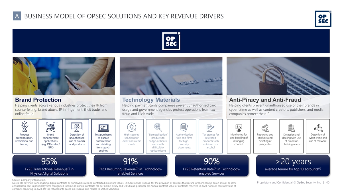 A BUSINESS MODEL OF OPSEC SOLUTIONS AND KEY REVENUE DRIVERS Brand Protection Technology Materials Anti-Piracy and Anti-Fraud Helping clients across various industries protect their IP from Helping payment cards companies prevent unauthorised card Helping clients prevent unauthorised use of their brands in counterfeiting, brand abuse, IP infringement, illicit trade, and usage and government agencies protect operations from tax cyber crime as well as content creators, publishers, and media online fraud fraud and illicit trade companies protect their IP Product Brand Detection of Test purchases High-security “Demetallisation” Authentication Tax stamps for Monitoring for Reporting and Detection and Detection of authentication, enhancement unauthorised to pursue solutions for products to foils and films restricted and blocking of analytics and dealing with use cyber crime and verification, and applications use of brands enforcement debit and credit badge authentic for high- products such infringing delisting of of brands in use of malware tracing (e.g. QR codes / and products and delisting cards cards with security as tobacco or content piracy sites phishing scams NFC) from search difficult to documents alcohol engines replicate icons 95% 91% 90% >20 years (1) (2) (3) (4) FY23 Transactional Revenue in FY23 Recurring Revenue in Technology- FY23 Retention Rate in Technology- average tenure for top 10 accounts Physical/digital Solutions enabled Services enabled Services Source: Company information. Proprietary and Confidential © OpSec Security, Inc | 40 Notes: (1) Revenue from ongoing digital contracts or frameworks with no contracted minimum values. (2) Contractual revenue for the provision of services that recurs (predominantly) on an annual or semi- annual basis. This is principally time recognised income on annual contracts for our online piracy and OBP/Fraud products. (3) Annual contract value of contracts renewed in 2023 / Annual contract value of contracts renewing in 2023. (4) top 10 accounts based on revenue and relates to OpSec Solutions.